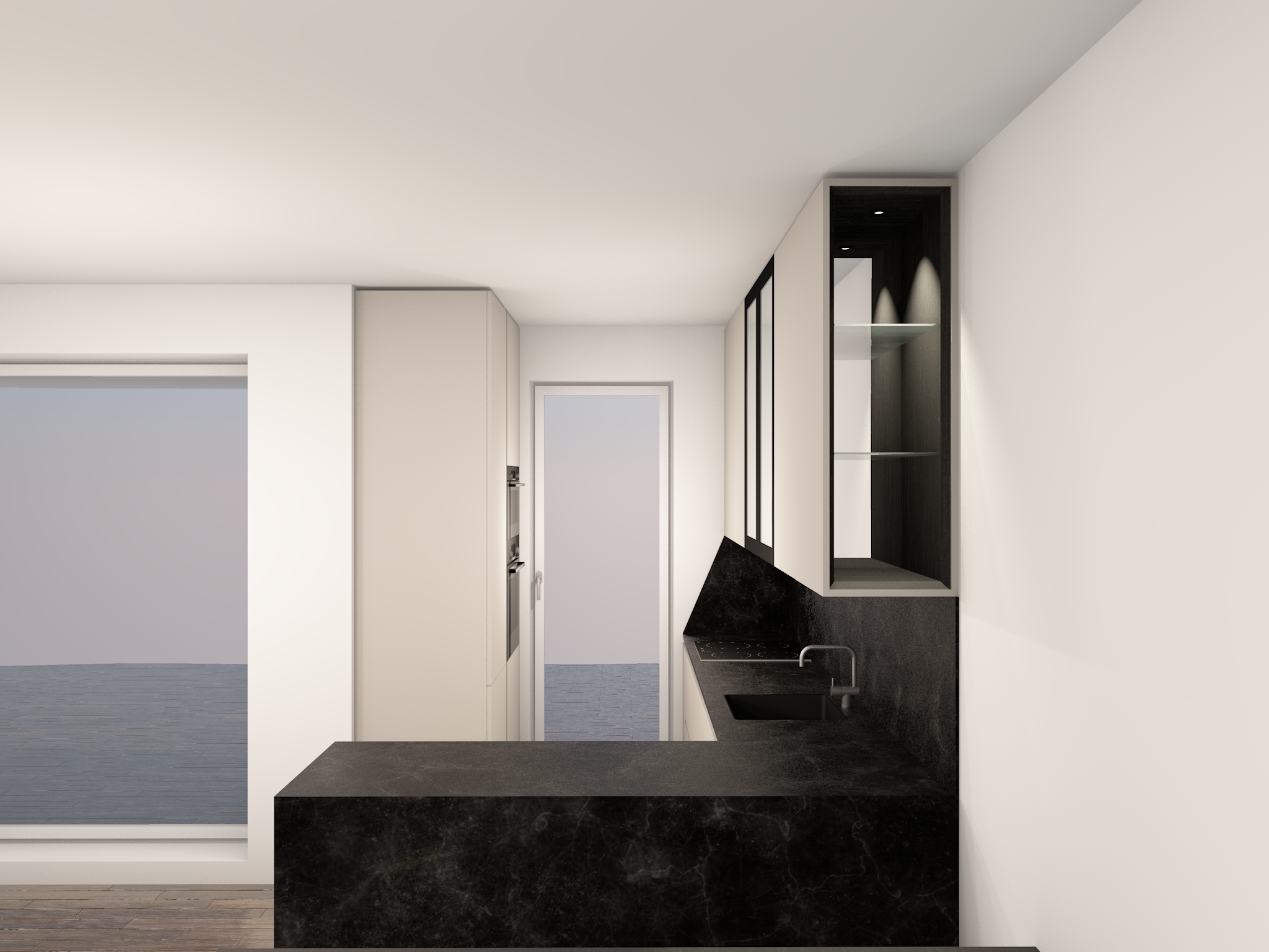 soft white modern kitchen kitchen realistic render high detailed add kitchen accesories black frame of the glass cabinets glass inner shelves mirror on the end of glass cabinets