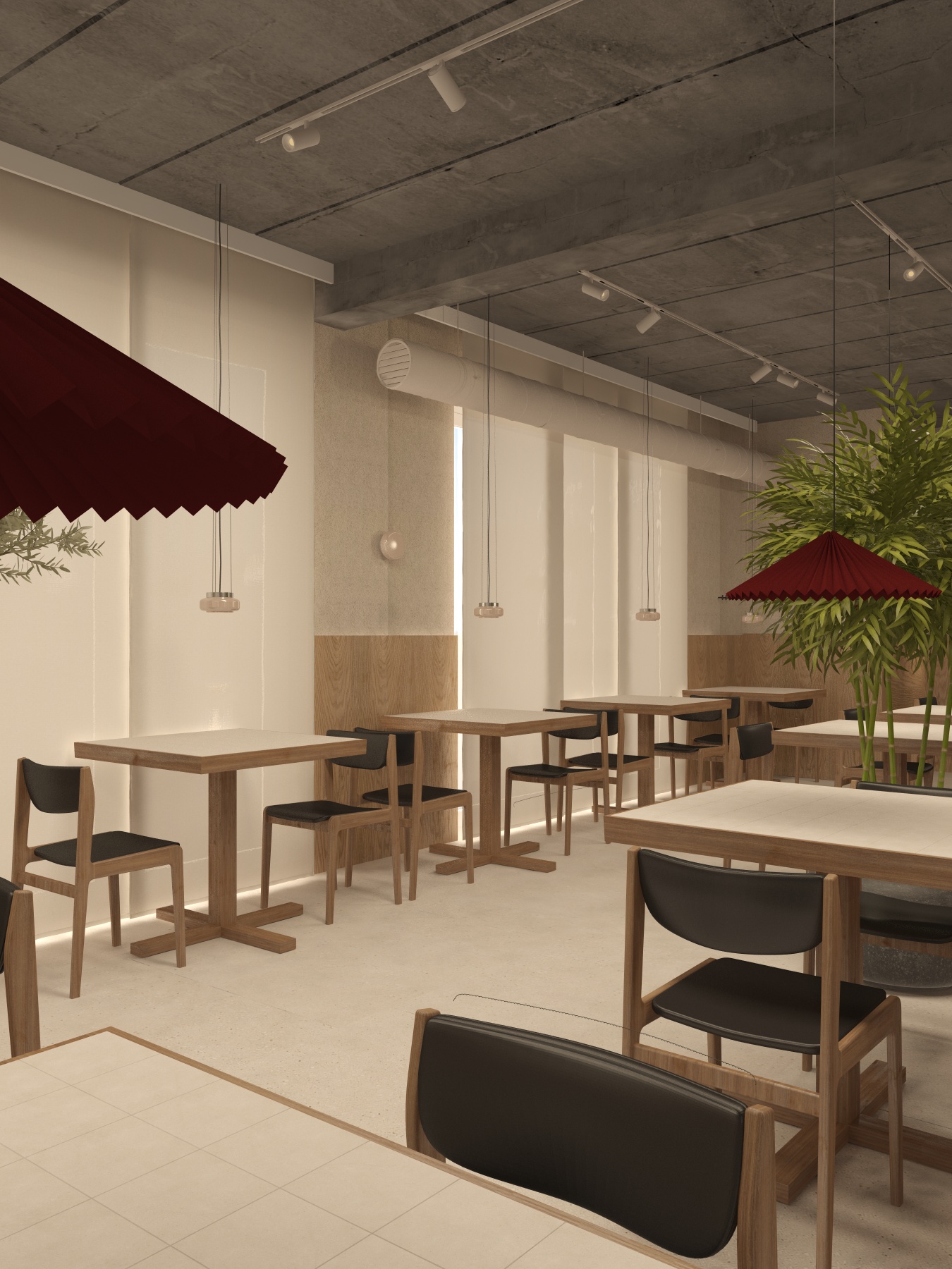 enhance the render to achieve a higher level of photorealism while strictly preserving the original design do not modify geometry layout proportions architectural elements furniture placement or object shapes do not redesign restyle or replace any elements maintain the exact composition and spatial relationships material and scene description the floor is finished with large format matte tiles surface is smooth non glossy with soft light diffusion and no reflective shine the chairs are dark wood the upholstery is black leather with a subtle natural matte sheen the tabletops are clad with 10x10 cm tiles evenly arranged with visible grout lines and precise alignment the ceiling is raw unfinished concrete with natural surface texture and subtle irregularities typical of cast concrete the windows are dressed with natural linen japanese style blinds noren style soft and slightly textured allowing diffused light to enter while maintaining privacy lighting conditions the scene is illuminated primarily by ceiling mounted light fixtures artificial lighting is dominant neutral in color temperature soft and diffused very little daylight enters the space and it is highly diffused with no direct sunlight and no sharp shadows realism enhancement requirements physically accurate artificial light behavior realistic light falloff inverse square law natural global illumination soft contact shadows subtle ambient occlusion accurate material roughness response delicate surface micro variation very subtle no material change balanced exposure no color shift no saturation boost no white balance modification increase realism strictly through lighting physics shading accuracy shadow softness depth and micro contrast without altering geometry or materials