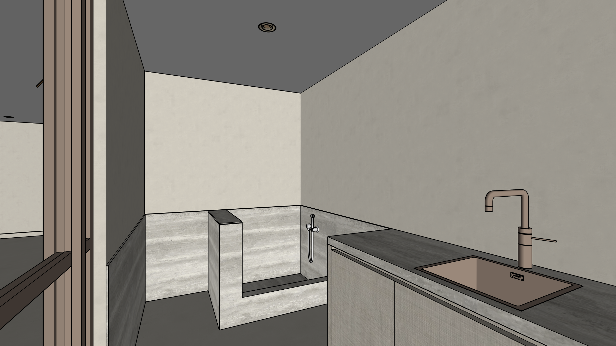 a precise high resolution photorealistic architectural photograph capturing the dog shower and utility corner seen in image 22 png from the identical camera perspective the scene should be rendered with a beautiful soft and warm light emanating from the single recessed ceiling spotlight casting subtle highlights and deep rich textures throughout the material rendering is crucial and must be exact the primary upper walls are a textured smooth soft beige concrete finish with a matching soft beige tiled wainscoting and dog wash station clad in large format ceppo di gr ivory stone tiles ivory and grey aggregate stone the foreground counter is also topped with the ceppo di gr ivory stone the cabinetry fronts beneath the sink are detailed with the specific decolegno penelope fa44 textured wood laminate the bronze steel and glass partition frame on the left is rendered with its specific metallic finish the hand held dog shower spray fixture in the dog wash and the modern bronze finished sink tap are perfectly detailed the perspective geometry and placement of all objects counter sink tap dog shower door ceiling fixture are identical to image 22 png only with the added soft spotlighting creating a refined and luxurious atmosphere