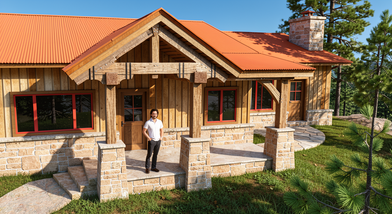 rustic stone chapel hand hewn timber frame mountain landscape flagstone path to front door aspen and pine trees evening time