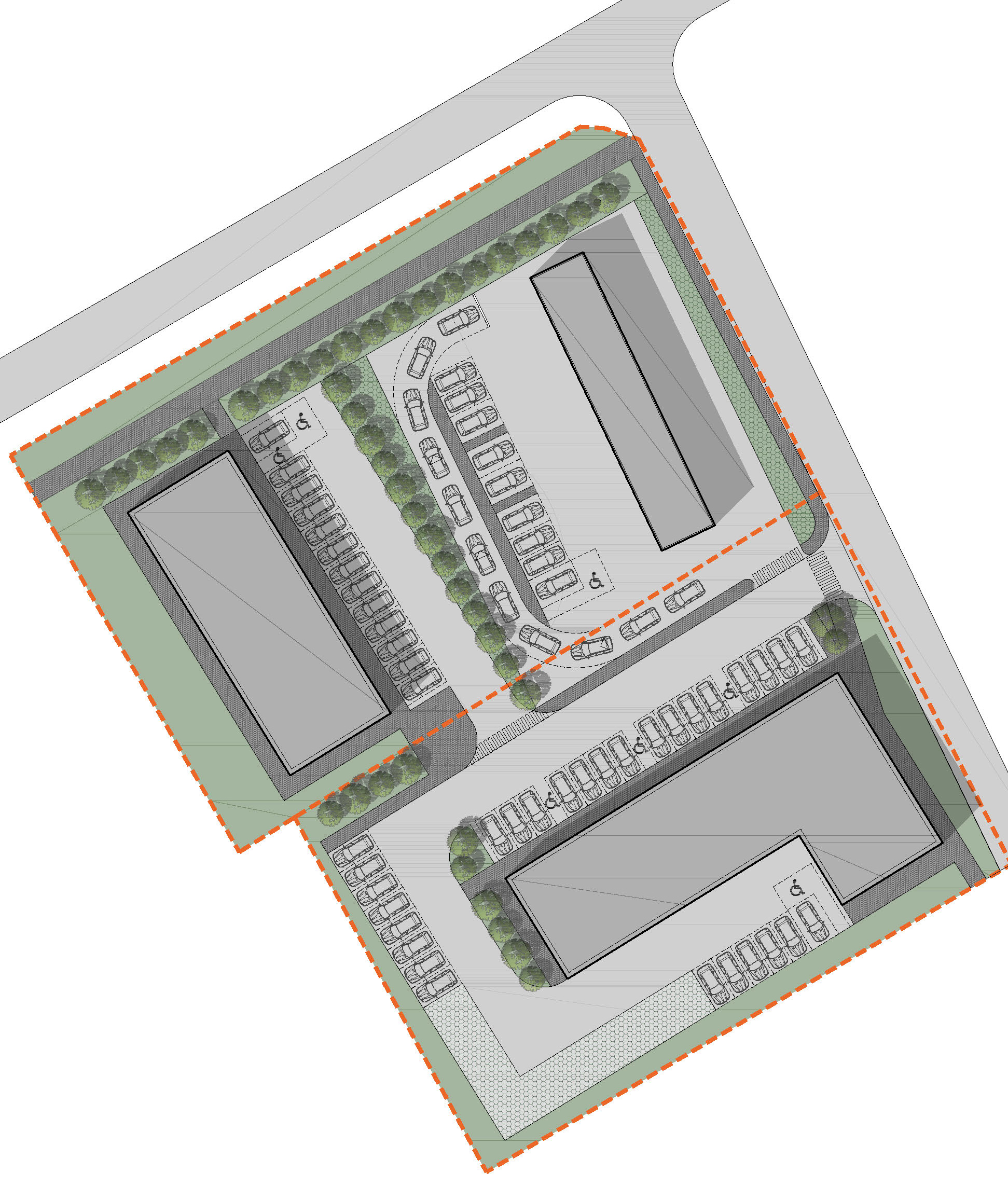 create a beautifully rendered architectural site plan use soft natural colors for the environment lush green for trees and grass soft gray for roads and pathways render the buildings in a modern white with light gray shadows vehicles should be a sleek silver add gentle sunlight casting soft shadows for a serene atmosphere highlight the perimeter with a subtle orange to indicate boundaries include detailed textures for roads and greenery to enhance realism