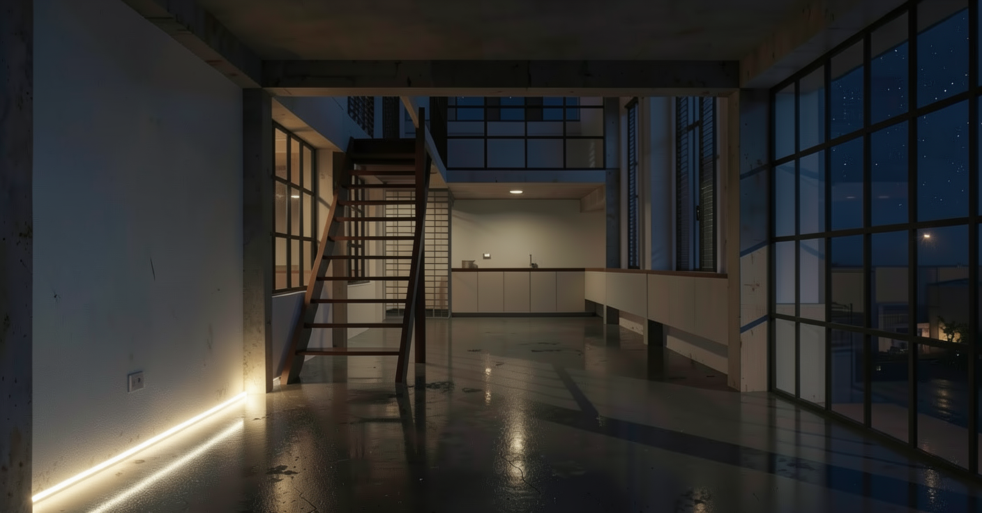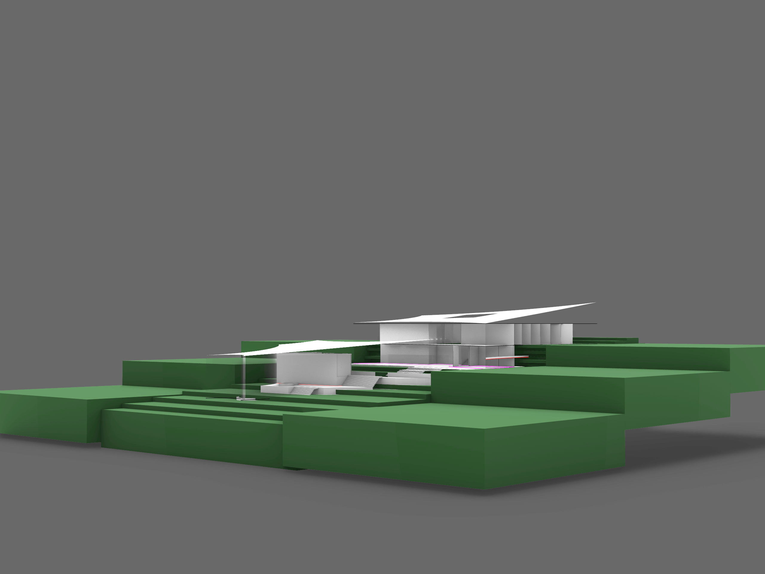 generisi mi render objekta koji je na slici belom bojom obojen tako da je svaki providni deo staklo i ne menjaj geometriju objekta dodaj staklo i u donjem objektu i da krov bude pod nagibom kao i visi objekat a od ovih zelenih kaskada napravi brdo zameni formu ovih zelenih blokova sa pravim brdom u kom se useca moj objekat i napravi ceo ambijent iza kao da je neka suma i zelenilo tako da se utapa sa brdom i napravi ga tako malo apstraktnim