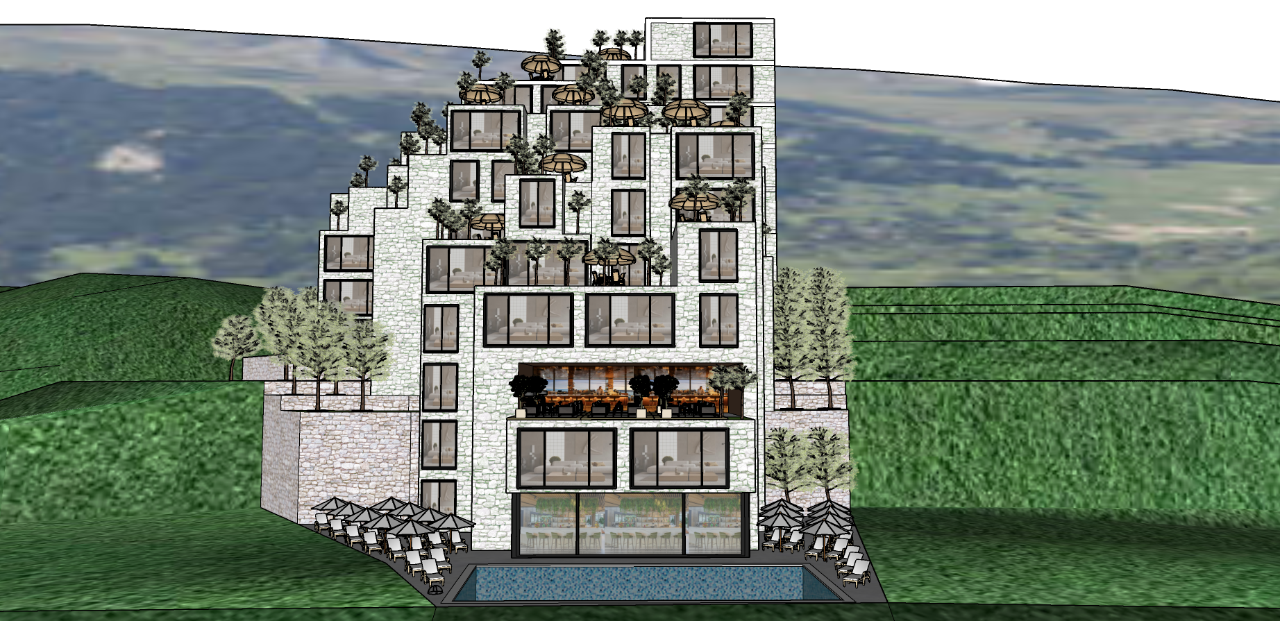 render a stunning architectural resort nestled in lush green mountains featuring cascading terraces with light grey stone walls put large tall and wide glass doors overlooking the terraces and also many windows in all the walls windows and doors have to prevail over the facade each terrace is adorned with vibrant green lawns and elegant parasols in soft beige the surrounding trees are a mix of muted silver and deep green foliage incorporate a luxurious inviting pool at the base with clear blue water the atmosphere exudes tranquility and harmony with nature with soft natural lighting emphasizing the serene setting please fill the surrounding hills with olive trees and some houses make it an elite residential zone render a stunning architectural resort nestled in lush green mountains featuring cascading terraces with light grey stone walls put large tall and wide glass doors overlooking the terraces and also many windows in all the walls windows and doors have to prevail over the facade each terrace is adorned with vibrant green lawns and elegant parasols in soft beige the surrounding trees are a mix of muted silver and deep green foliage incorporate a luxurious inviting pool at the base with clear blue water the atmosphere exudes tranquility and harmony with nature with soft natural lighting emphasizing the serene setting please fill the surrounding hills with olive trees and some houses make it an elite residential zone