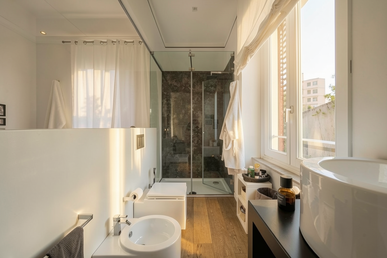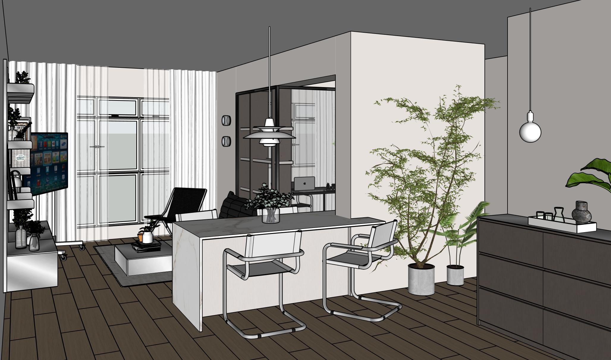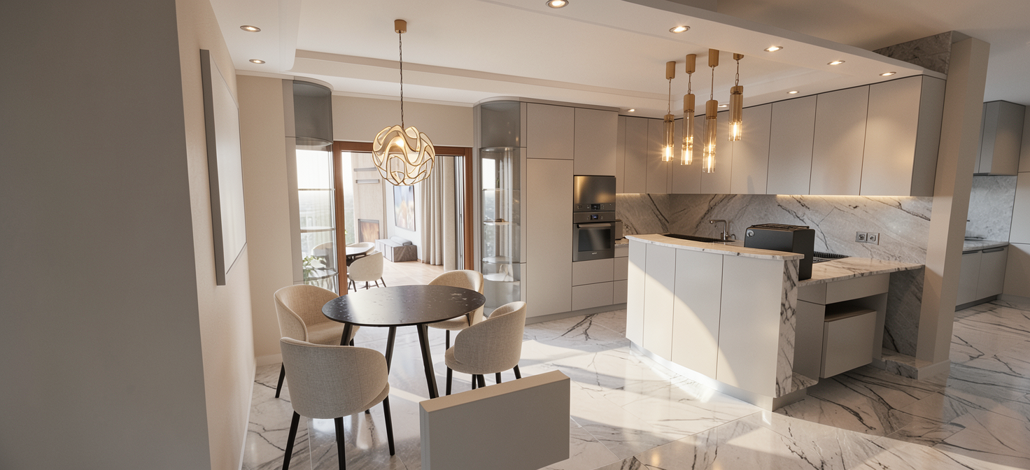 colours and texture to remain accurate as per original picture dining table top in white gold marble leg support in off white beige wood laminate with subtle wood grains open shelving in stainless steel coffee table in stainless steel low counter in stainless steel top and dark grey wood with subtle grains flooring in light wood grains subtle grains beam on top of full height glass
