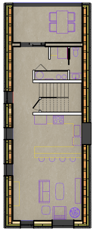 modernist aerial shot help me turn this image into a 3d birds eye view floor plan it doesnt have to look super realistic can you keep everything where it is and maintain the same colors add furnture in place of the blue and orange lines make sure to add the windows and doors dont add anything thats not already there architecture