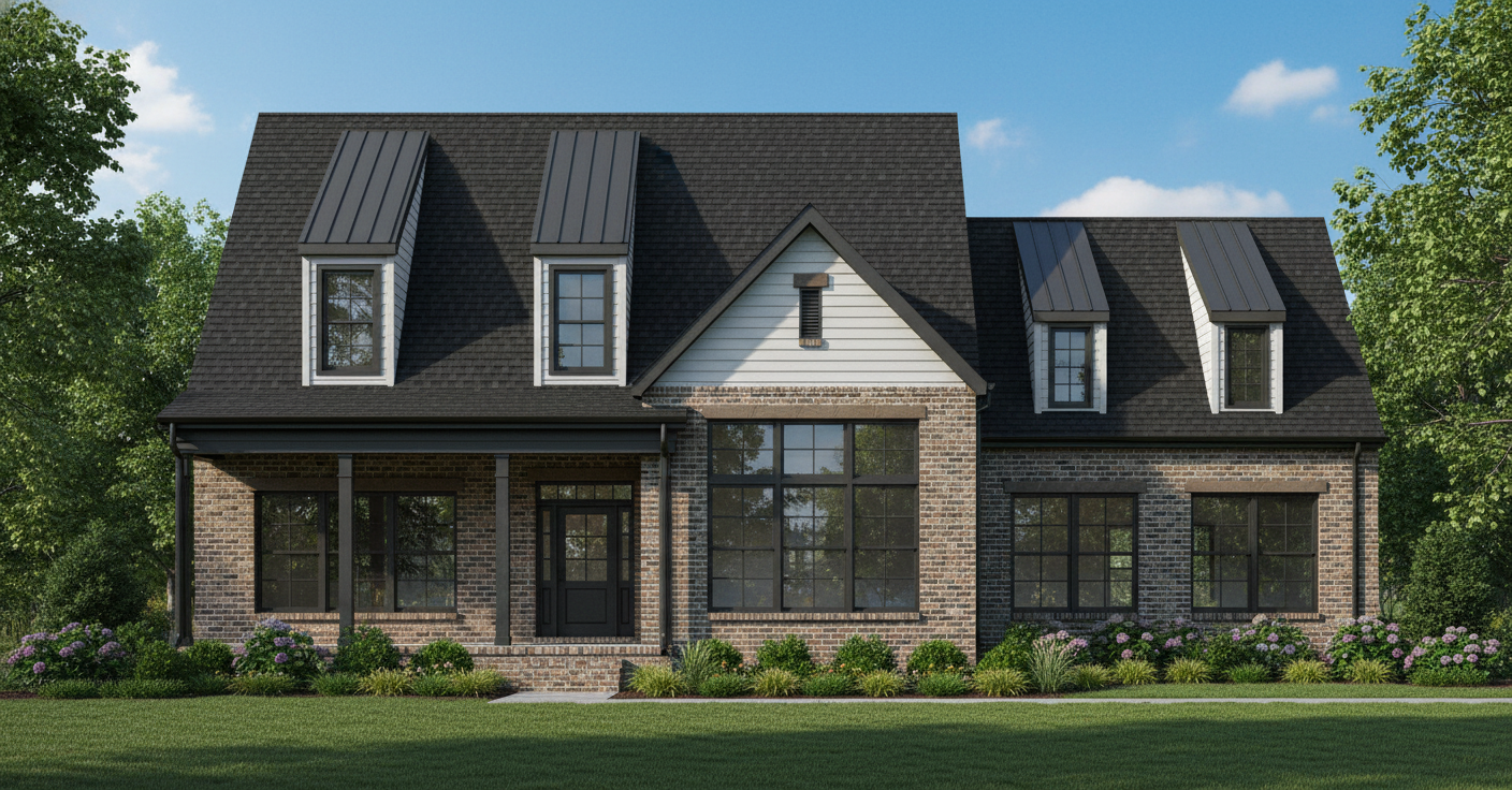 nordic exterior shot render with adirondack style dark painted siding heavy timber accents tall grass in foreground wooded setting sunset sky architecture