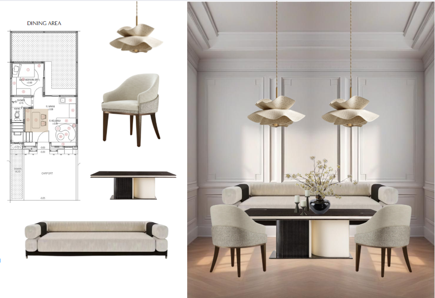 create a modern dining room with a cozy minimalist atmosphere include a creamy soft textured sofa with two tone gray and charcoal pillows add a soft white throw draped over the sofa arm place a large white textured area rug on light wood flooring feature a wooden oval coffee table in front of the sofa with books and a glass on it include a striped cylindrical ottoman in beige and cream position a large potted green plant in a neutral pot to the right of the sofa on the wall hang a grid of six framed art pieces with minimalist black and white sketches in gold frames complement the setting with a tall arched floor lamp with a black stand and a brass dome shade creating a warm inviting light use a gentle soft gray for the walls to enhance the serene atmosphere