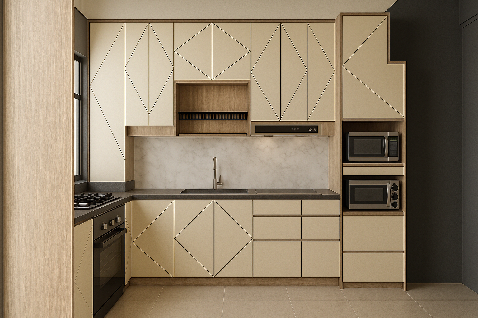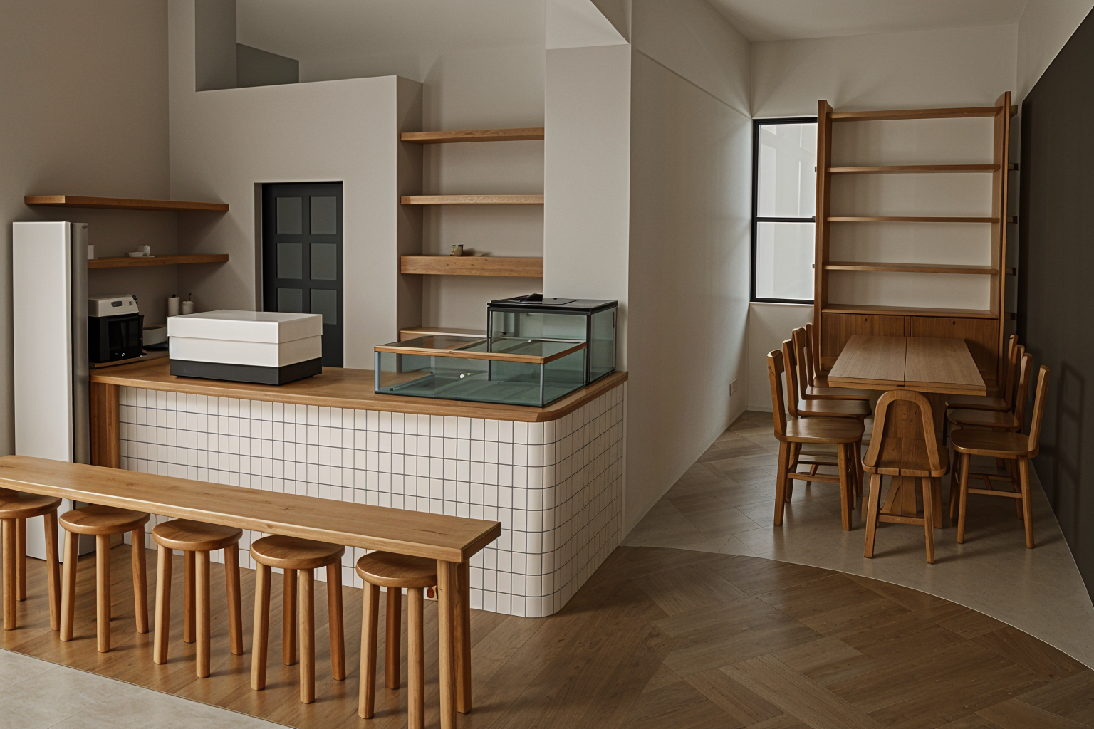 create a beautifully rendered modern kitchen with a warm and inviting atmosphere use dreamy natural light streaming through large windows casting soft shadows and highlights the wooden cabinetry should have a rift cut oyster oak finish complemented by sleek stainless steel appliances the countertops are white marble with subtle grey veining include contemporary white chairs with dark wooden legs around a matching white marble table the flooring is a smooth light grey limestone tile and the walls are a soft off white add a touch of greenery for a fresh feel perhaps a small plant on the countertop the overall mood is modern elegance with a serene and calm atmosphere