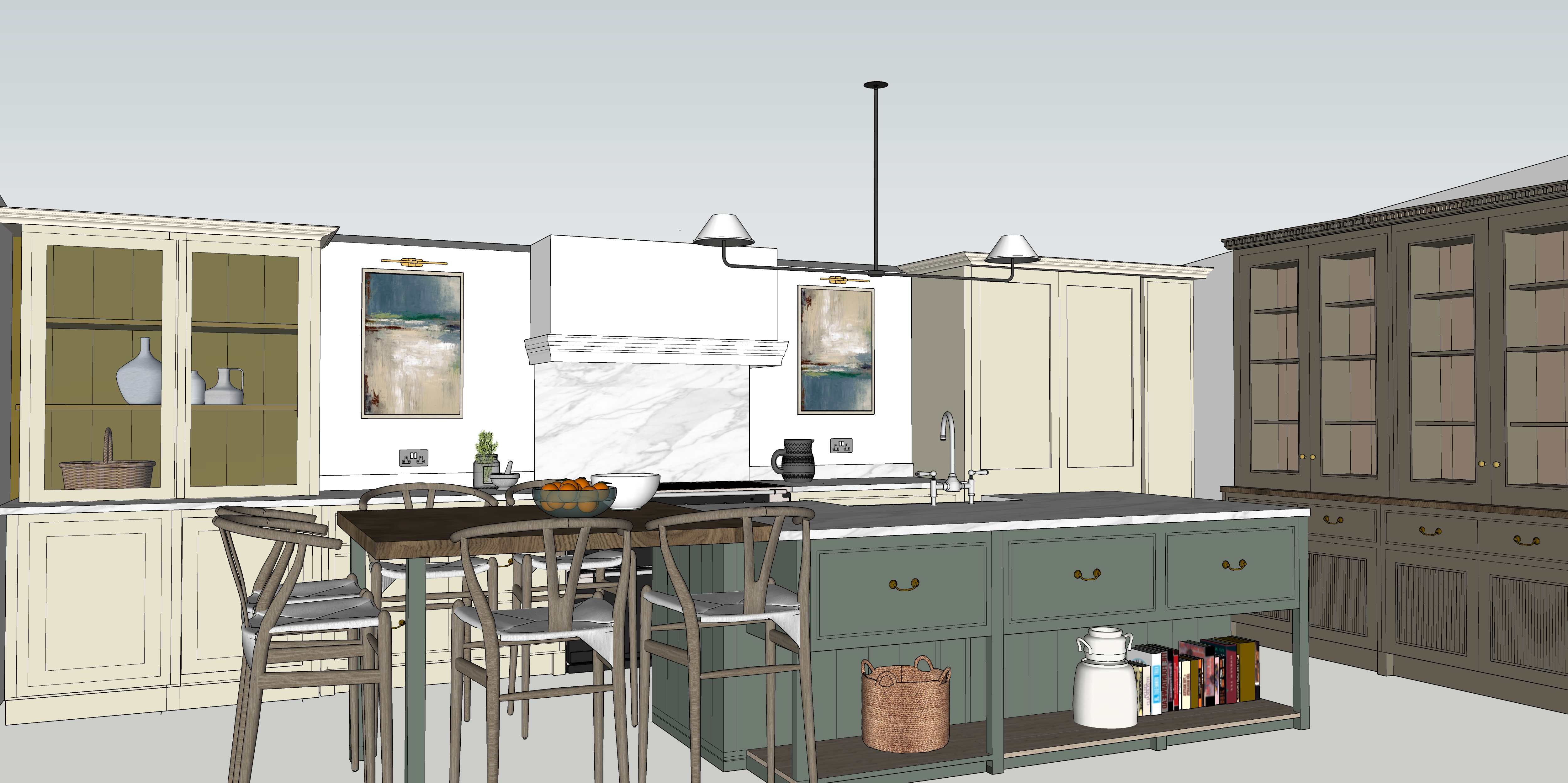 create a photo realistic render from the provided image include mood lighting shelves with recessed lighting within glazed cupboards lighting under drawers on island light limestone flooring