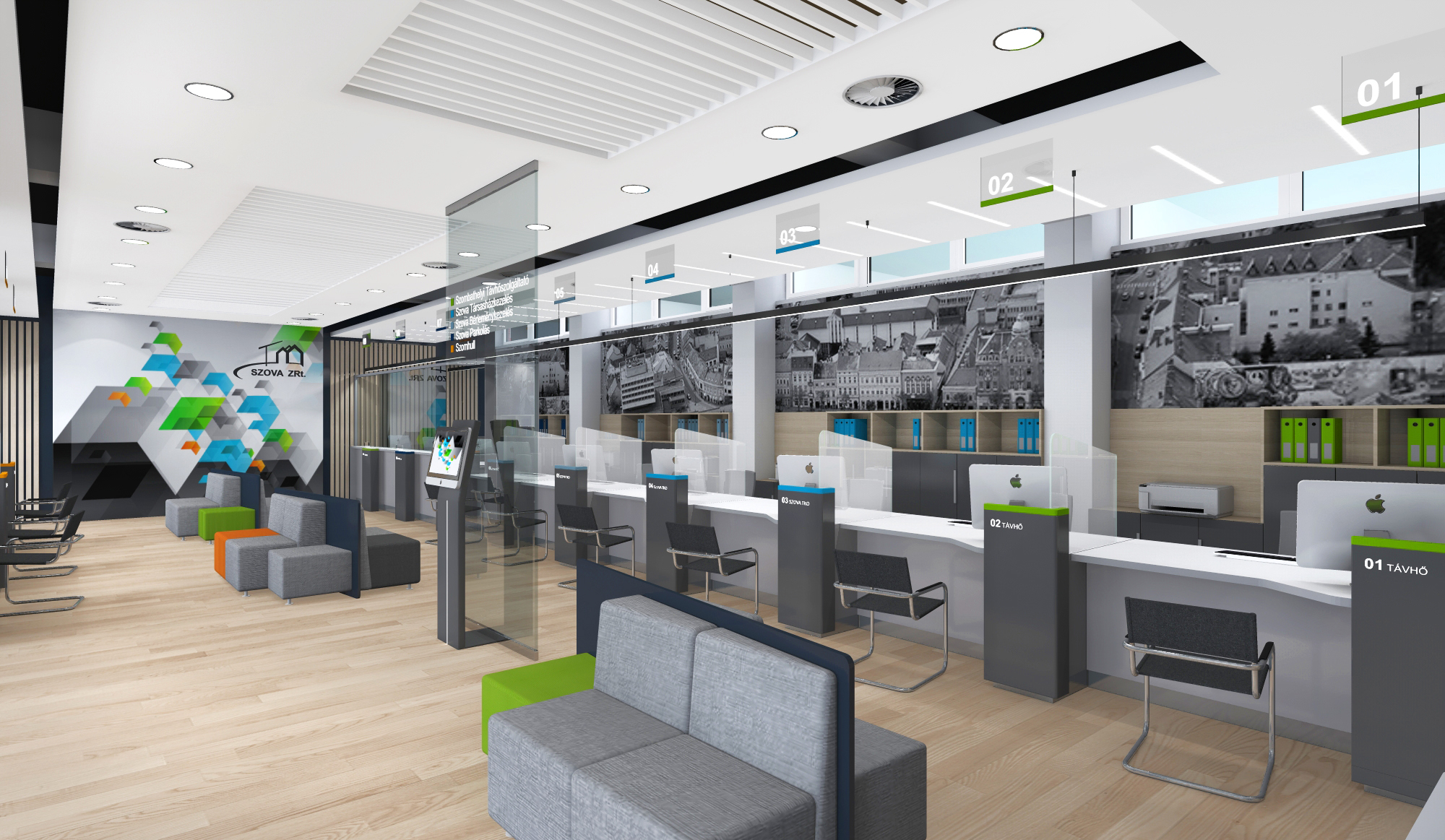 modern office interior spacious and well lit design features sleek minimalist d cor with a professional atmosphere walls painted in crisp white accented by geometric wall art in vibrant blue green and orange comfortable seating arrangements with grey fabric sofas and square stools in shades of grey with bright green and orange highlights flooring is light oak wood adding warmth reception desk with glass partitions and modern hardware including minimalistic grey office chairs with metal legs large grayscale photographs of cityscapes line the walls behind the desk ceiling with contemporary recessed lighting and an intricate design creating a bright and inviting ambiance incorporate subtle reflections and soft shadows for realism