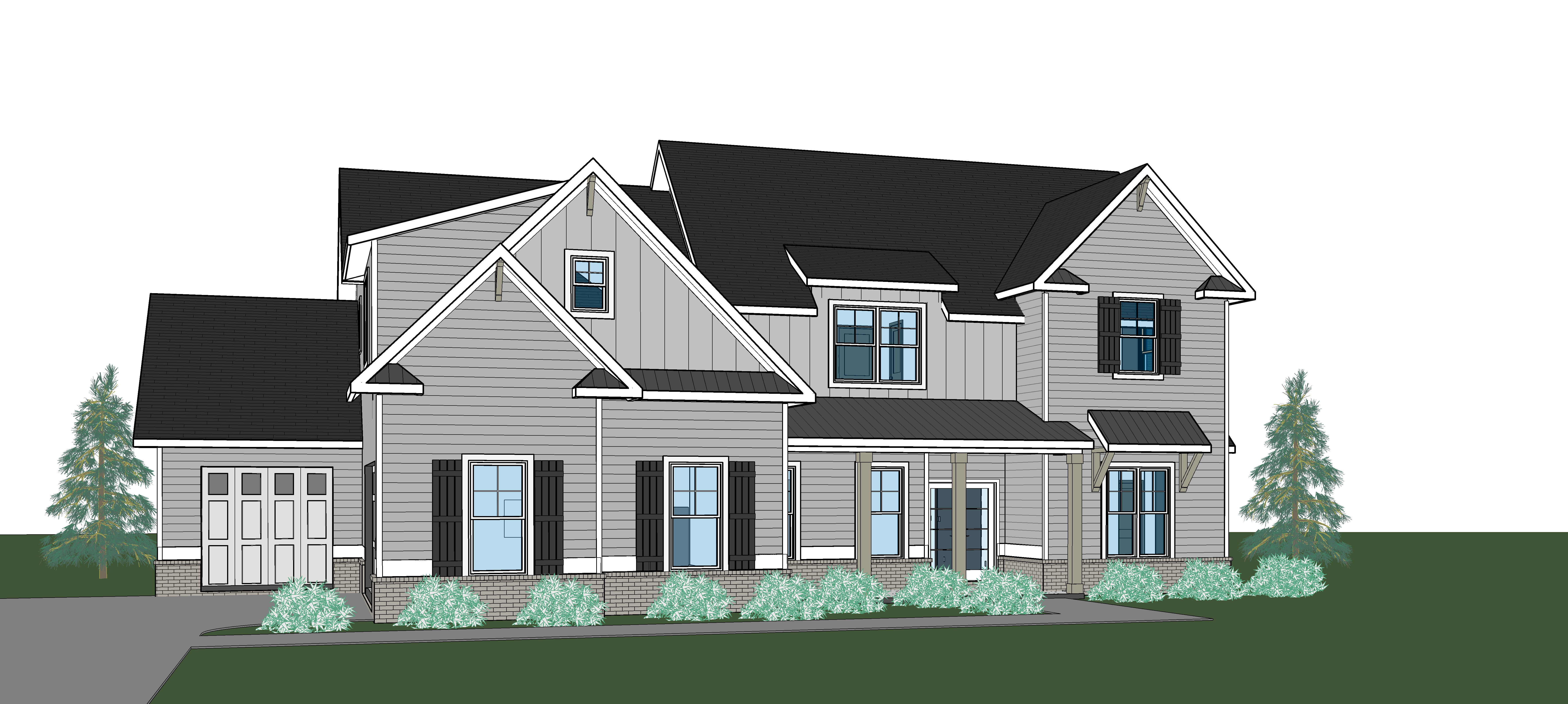 render a beautiful suburban house with a modern farmhouse aesthetic the house features light gray vertical and horizontal siding with crisp white trim the roof is a dark charcoal gray while the window shutters are a deep black the front porch has warm beige columns the surrounding landscape includes lush green grass and soft teal shrubbery add tall elegant pine trees in a muted green for a serene environment the atmosphere is peaceful with soft natural lighting casting gentle shadows