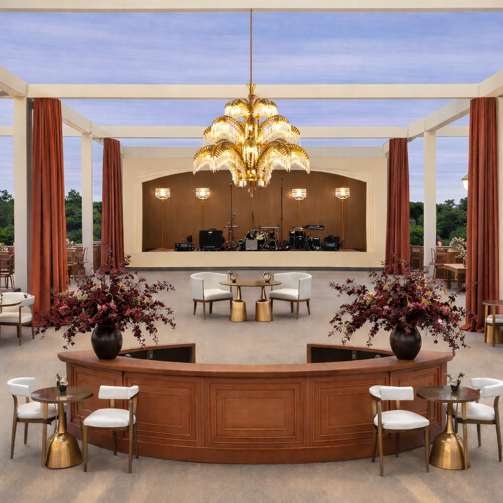 brighten up the stage facade to a warm white color keep the brown area on the stage backdrop