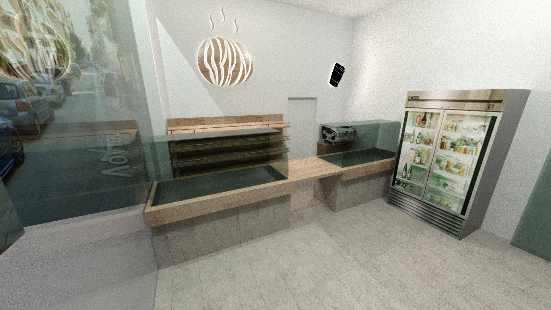 fill up the left display with sweet deserts fill up the right display with pastry items fill up the tall fridge with bevereges fill up only the shelves under the logo on the rear wall with breads keep the door on the wall as it is