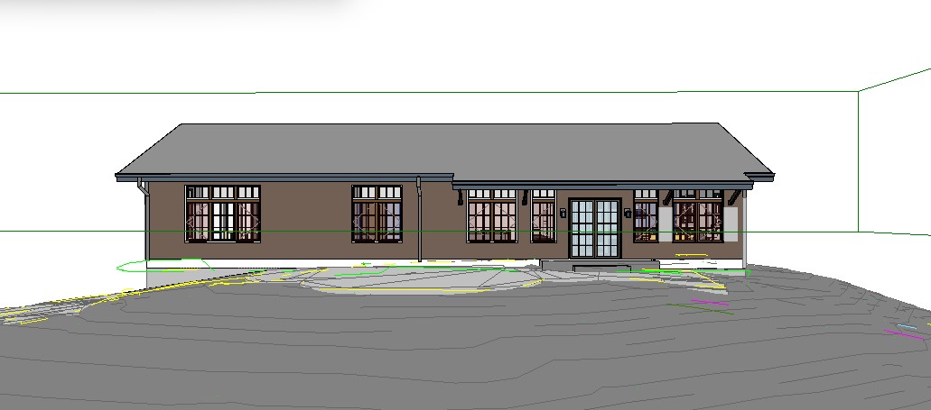 medium gray wood shake siding dark gray shingle roof modern landscape in front of house dark window trim and mullions modern stone base on house cloudy afternoon sky evergreen tree forest background brighter light from windows and doors overall brighter scene with more ambient light add glass to doors with mullions that match windows