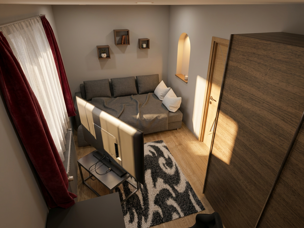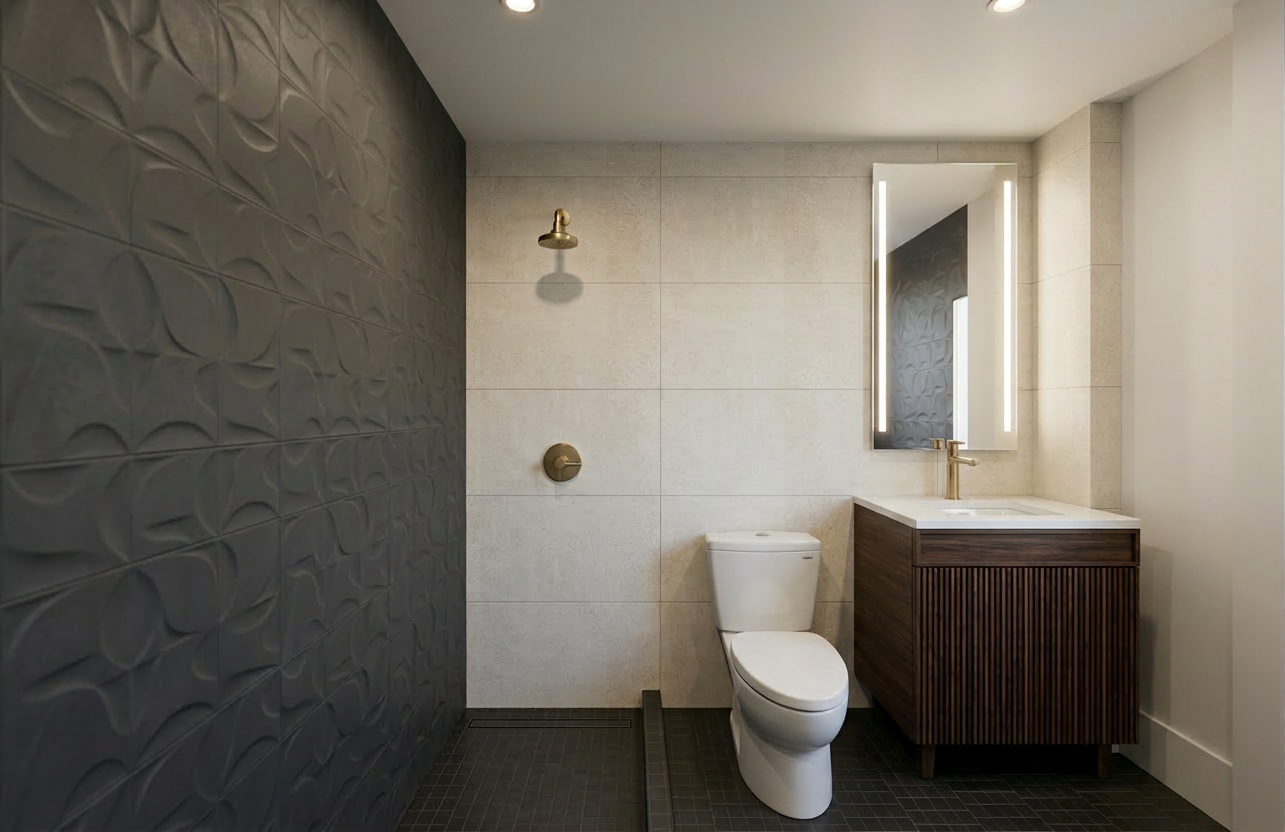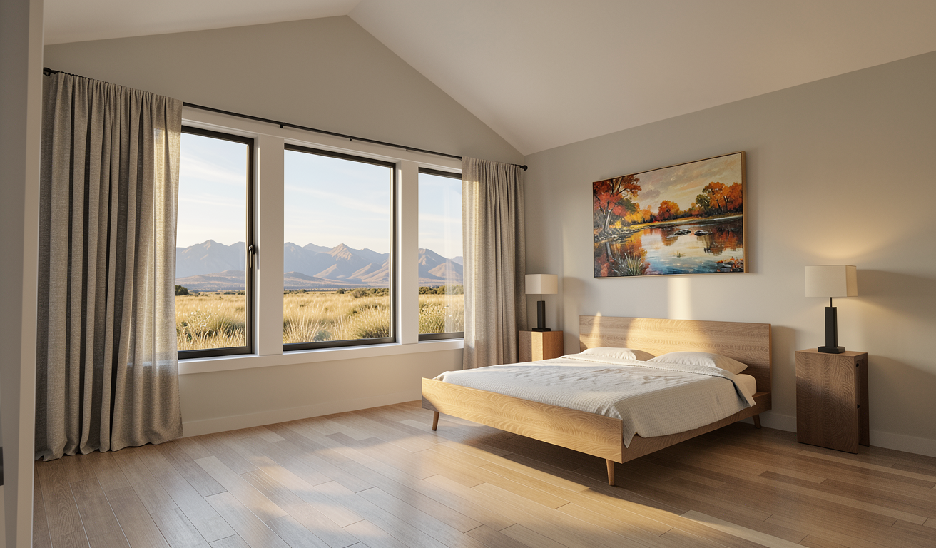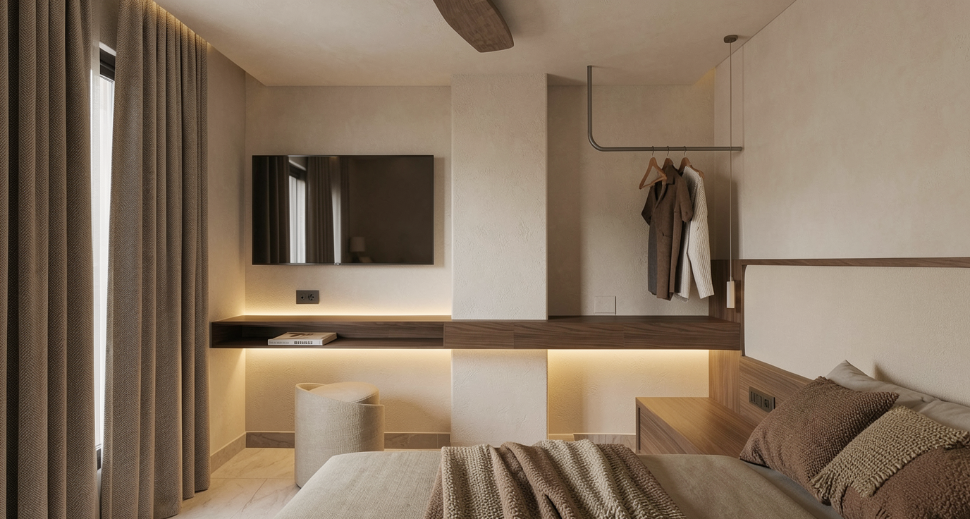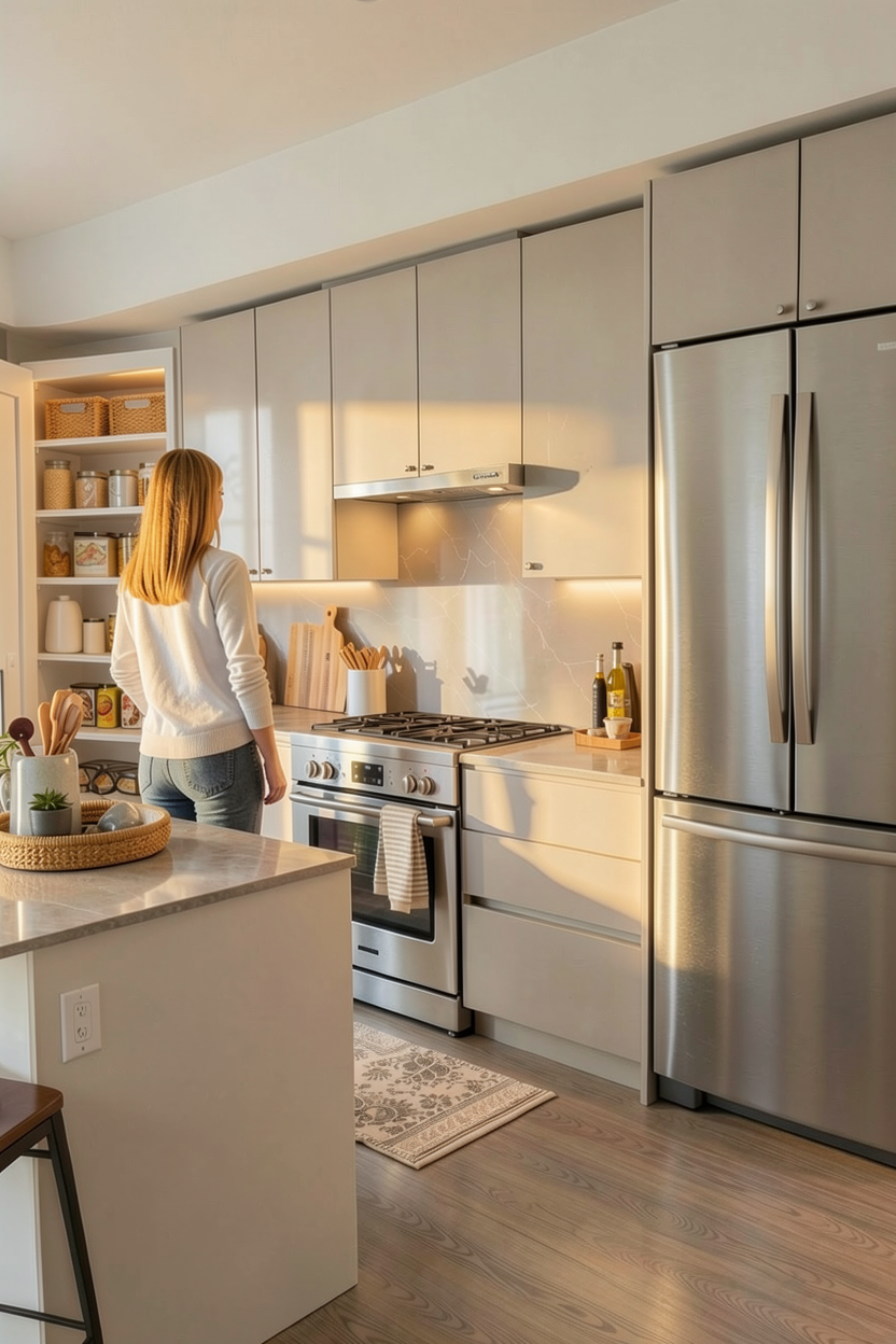 render a modern kitchen with a sleek minimalist design use neutral tones to create a calm and inviting atmosphere base cabinets in matte dark khaki countertops in smooth matte white the backsplash and walls are in crisp clean white wooden shelves add warmth with a light oak finish the floor is a matt muted beige tile dark stainless steel appliances and fixtures provide a slight shine contrasting with the matte surfaces large window allows natural light to flood the space enhancing the bright and airy feel the overall atmosphere is stylish modern serene and elegant