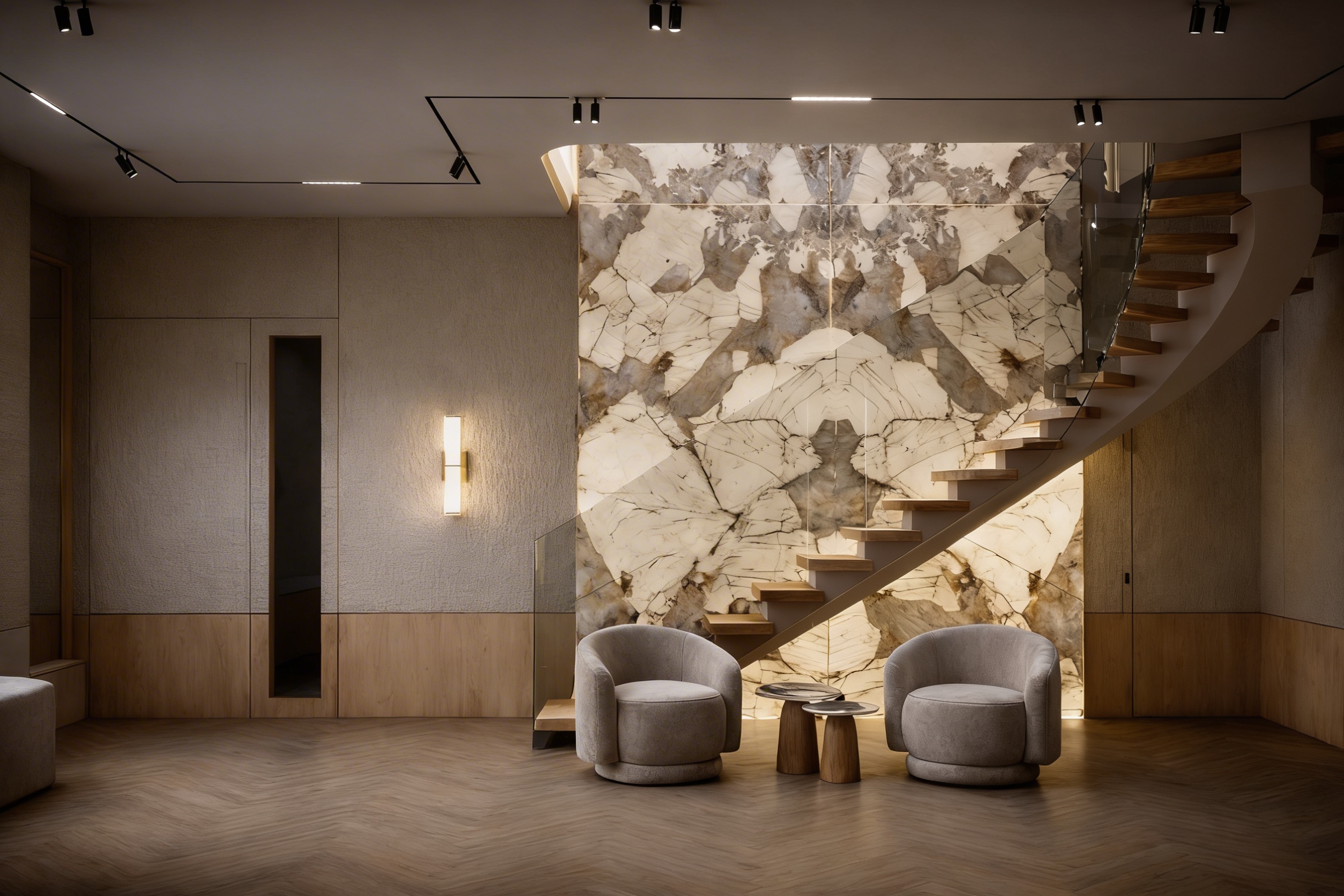 do not change anything about the architecture at all walls should be smooth troweled stucco that is a light sand color mixture or light brown metal guardrails and clear glass guardrails inner courtyard that has natural light landscape middle building has horizontal wood siding with clean modern lines vertical wood slats golden hour sky add people do not change the architecture at all