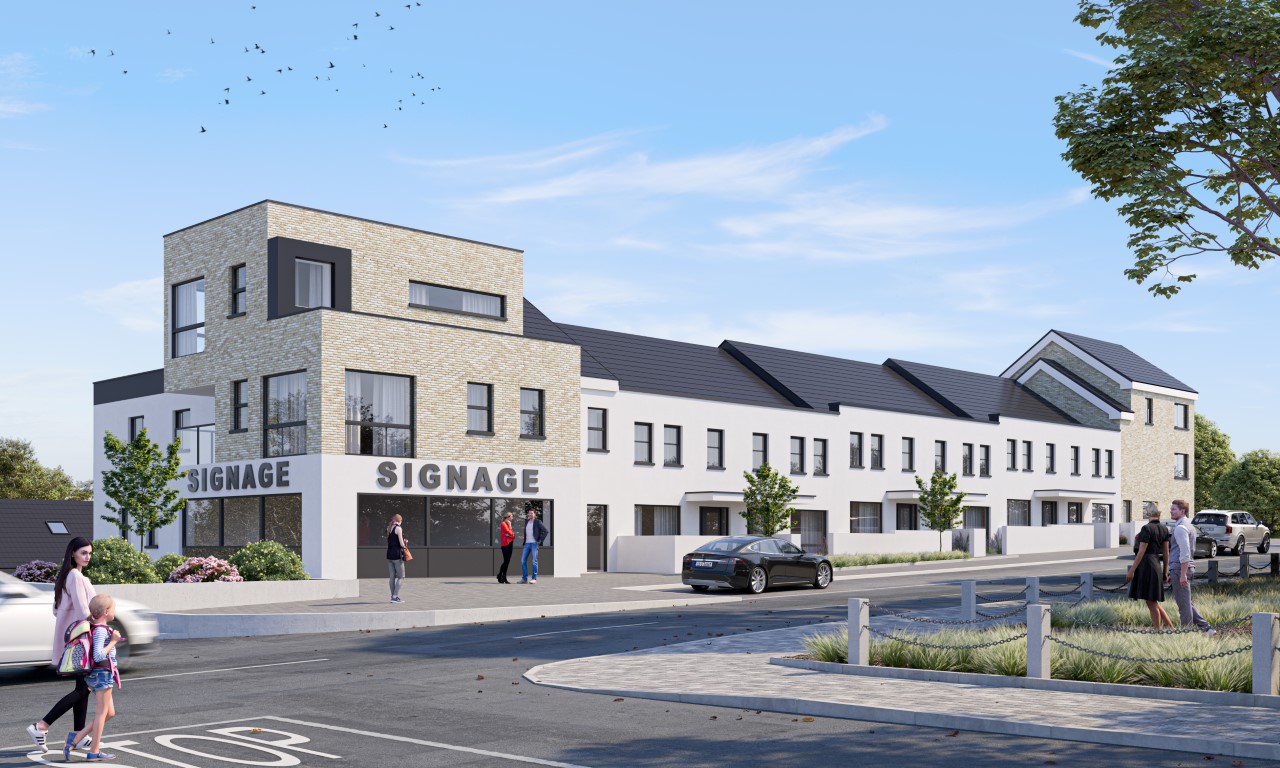 create a beautiful architectural scene of a modern row of houses with a minimalist design the buildings should have a mix of light beige brick and smooth white plaster walls large black framed windows and dark grey slate roofs the setting is a bright sunny day with a clear blue sky and a few scattered clouds lush greenery is incorporated with small trees and neatly trimmed bushes along the pavement include a few pedestrians in colorful attire walking along the sidewalk and modern cars parked on the street capture the essence of a calm suburban neighborhood with a welcoming and vibrant atmosphere