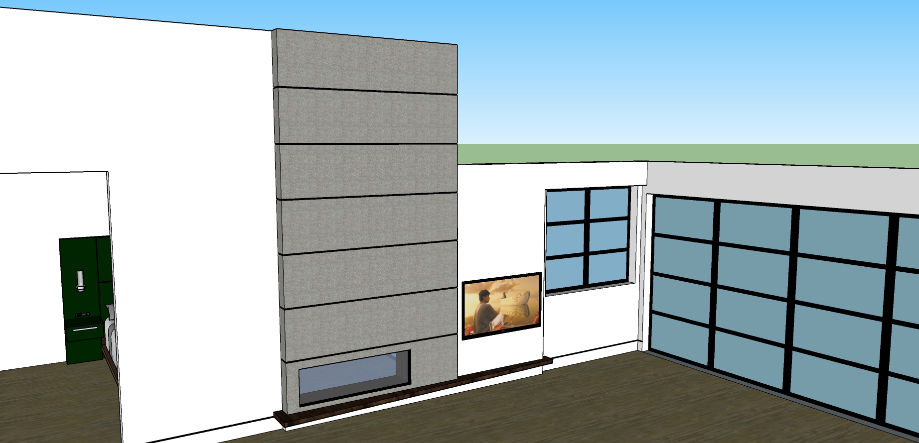 render a modern living room with a minimalist style the walls are bright white the ceiling features a large textured gray panel as a centerpiece the door is a deep forest green a sleek dark wooden floor that adds warmth to the space include a wall mounted television displaying a serene scene the windows are large black framed with clear glass allowing natural light to flood the room the lighting is soft and warm to create a cozy atmosphere the outdoor view features a clear blue sky capture the room in a photorealistic style with precise details and a polished finish