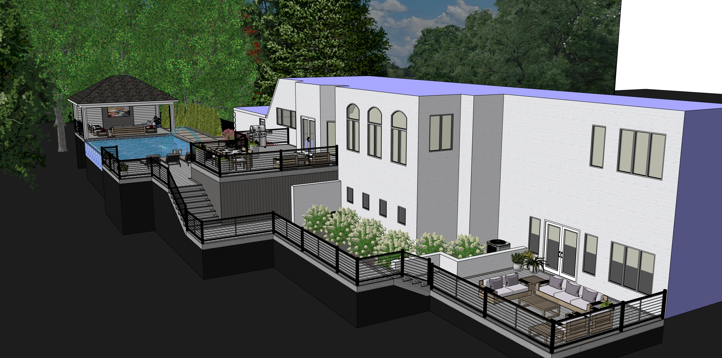 create a photorealistic exterior rendering from this sketch up view use realistic materials accurate scale and natural proportions apply soft daylight with realistic shadows global illumination and subtle reflections enhance textures without changing geometry maintain the original camera angle and composition produce a clean professional real world visualization