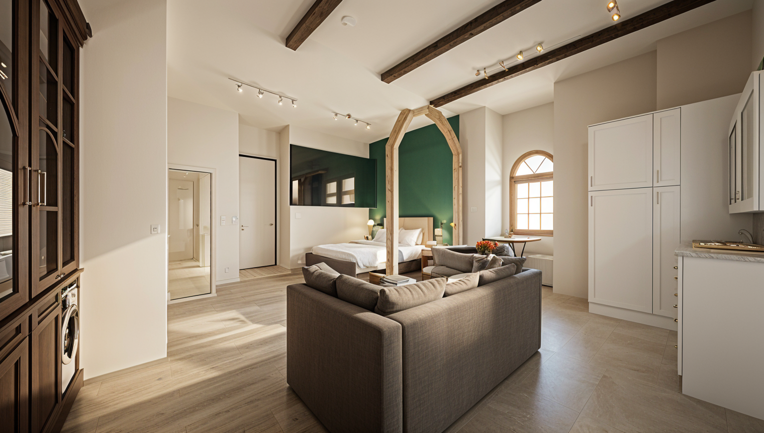 adjust lighting and material finish only introduce soft realistic natural daylight coming from the front of the space as if from an open arched entrance door directly behind the photographer the daylight should gently wash into the room and fade progressively toward the back with no visible source the rear stair area should remain naturally lit but subdued with no glow hotspots or exaggerated brightness turn the chandelier gently on with a warm low intensity glow it should be decorative and secondary not a primary light source the entrance desk worktop is portoro style stone deep brown black stone with fine subtle golden veining elegant and understated not glossy or high contrast adjust the stone floor to appear honed and matte with soft broken reflections only no polished or mirror like sheen add soft warm undershelf led lighting to the bookshelf on the left hand side only no lighting to the right hand joinery wall remove any linear or integrated lighting from that side preserve all geometry architecture proportions materials colours furniture branding and camera position exactly as they are no new openings no added windows no additional light sources no design reinterpretation