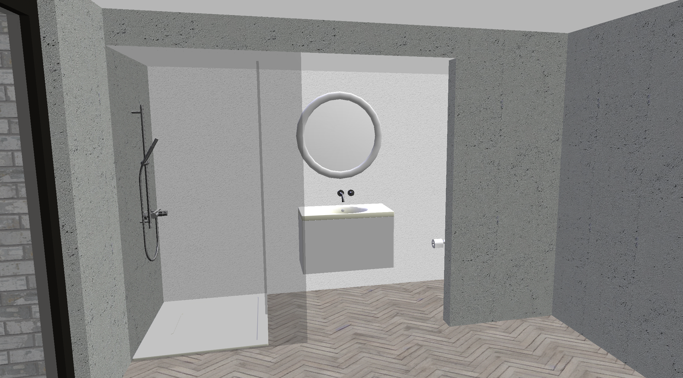 genau dieses rendering berarbeiten fotorealistisches innenraum foto exakt dieselbe perspektive und kameraposition wie das hochgeladene referenzbild 100 identische raumgeometrie exakt gleiche m belanordnung exakt gleiche verlegeart und richtung von parket und platten wie vorlage parket ruhig und hellgrau weiches nat rliches tageslicht raum k nstlich ausleuchten sanfte realistische schatten realistische materialien stoff mit leichten gebrauchsspuren hochwertige oberfl chenreflexionen lavabo komplett aus marmor collemandina grigio in braungrau dunkel lavabo innen ebenfalls collemandina im unterbau im obersten drittel eine griffmulde ber die ganze breite ganzer unterbau in collemandina unterbaum bel mit unterbaubeleuchtung dahinter eine gessi wandarmatur edelstahl vollkommen rahmenloser und hinterleuchteter spiegel mit echten spiegelungen links neben dem lavabo ist die dusche armatur ersetzen mit thermostatmodul axor select 460 90 mit stabhandbrause und grosser brause mit anschluss aus der wand alles in edelstahl geb rstet an der hinteren wand eine nische dellco in box luna in der gr sse 30x30cm mit led licht w nde in der dusche und boden collemandina grigio in braungrau alle sichtbaren w nde sind sichtbeton schwarze steckdose rechts vom lavabo auf gleicher h he wie die armaturen schwarze runde deckenspots im bad und im zimmer parket im zimmer ruhig und hellgrau boden im badbereich collemandina grigio in braungrau links bei der dusche ein grau get ntes durchscheinendes glas fassade aussen aus hellgrauem klinker sehr moderner minimalistischer look nat rliche farbwiedergabe golden hour feeling hell ausleuchten das bild muss wie eine professionelle fotografie aussehen es soll ein echtes und reales foto sein canon eos r5 35 mm festbrennweite f 2 8 hyperrealistisch dslr qualit t raw aufnahme 8k aufl sung extrem scharf perfekte tiefensch rfe professionelle architekturfotografie