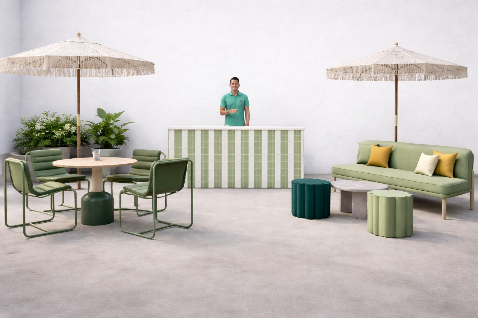 add people sitting and at a the bar interion exhibition hall light keep original floor and wall