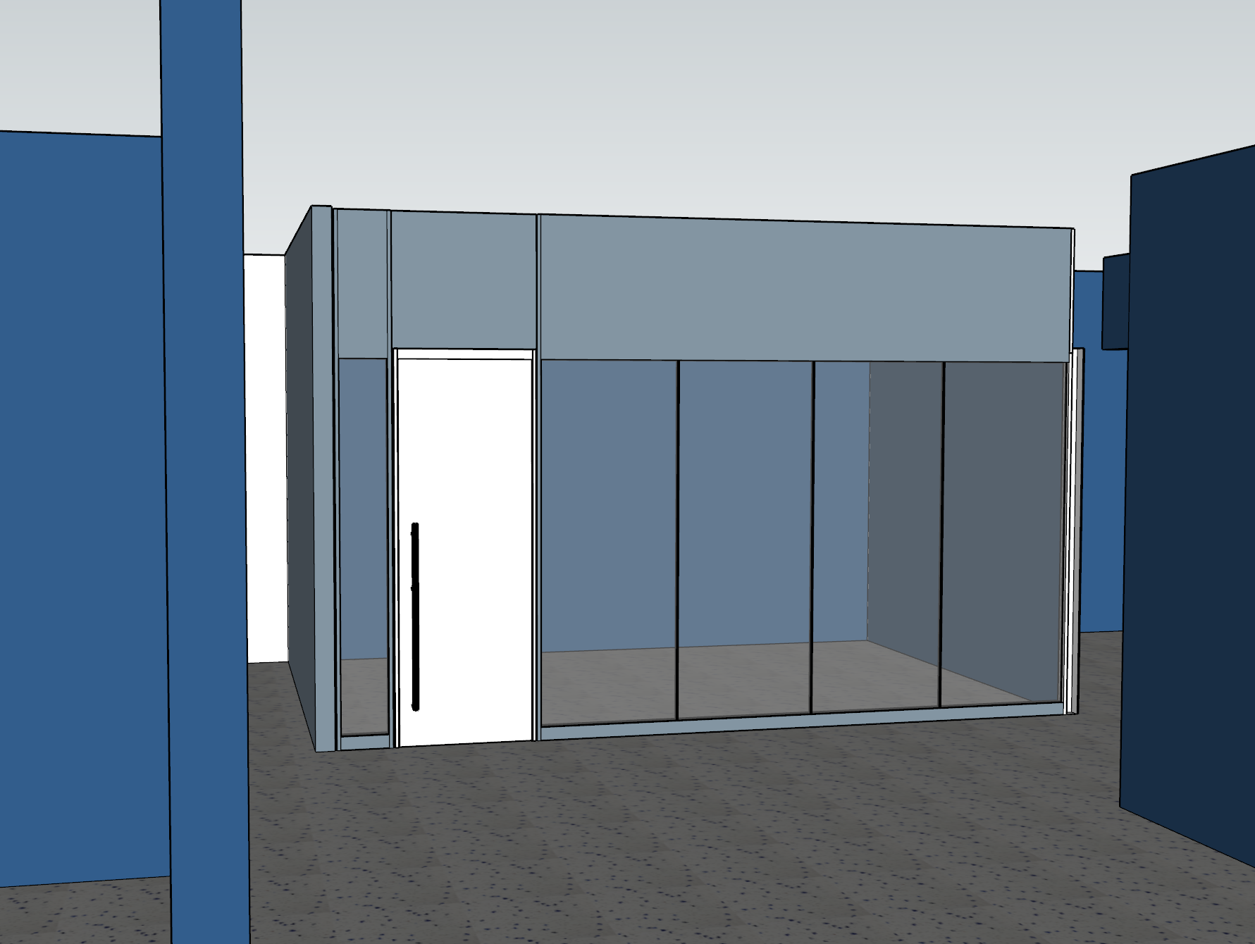 add a ceiling and lights to the interior of this corporate office building the large room in the middle is a break room so add tables and a sign above the door that says break make the ceiling plain white tiles and the floor inside of the break room white tile