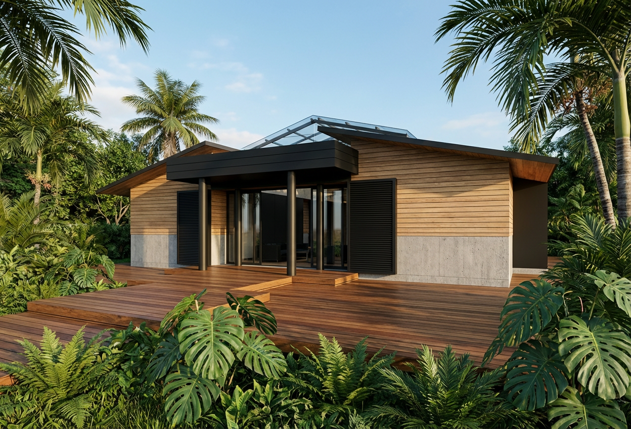 contemporary tropical minimalist house identical to the reference image preserving exact composition camera angle proportions and overall scene natural wood cladding on upper walls exposed concrete base matte black architectural elements transparent glass roof floor to ceiling sliding glass doors and round matte black columns enhance lighting with soft golden hour sunlight improved global illumination richer shadows and subtle reflections for a more realistic and cinematic atmosphere replace all wooden deck surfaces and horizontal wooden flooring with natural green grass seamlessly integrated into the landscape maintaining the same levels and geometry keep all other materials unchanged lush tropical vegetation with palm trees dense greenery and large leaf plants monstera ferns ultra realistic materials strong indoor outdoor connection 4k cinematic composition