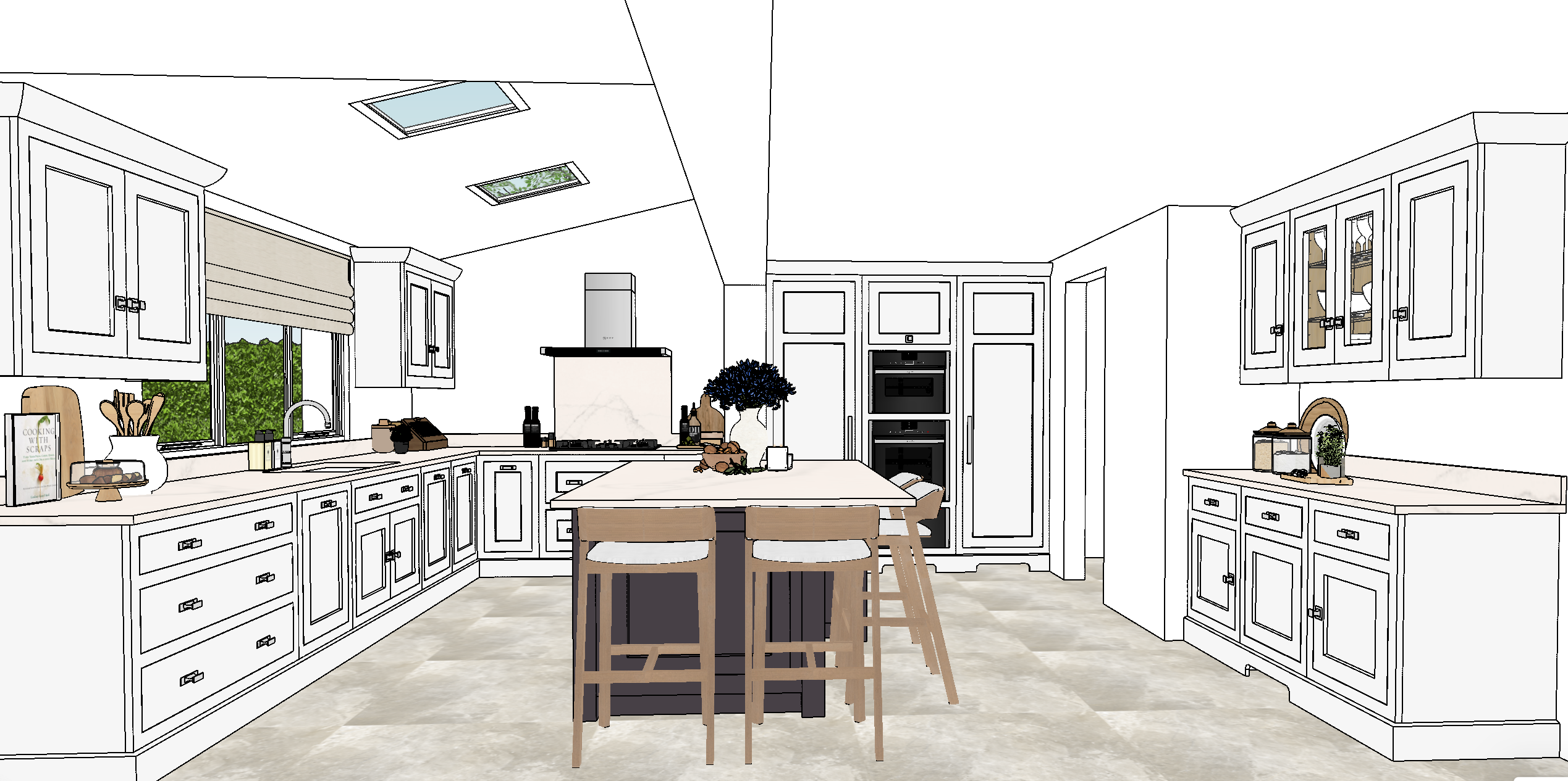 lifelike maintain all cabinetry colours and detail please dress as luxury kitchen show the cabinets on the right hand side with antique mirror cplashback between the counter and the wall units and dress the counter below as a bar increase the size of the vellux windows in the ceiling
