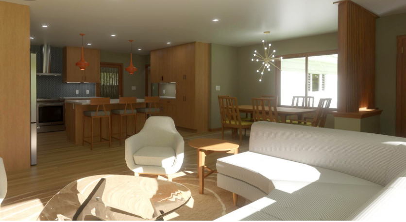 create a built in dining area where the dining table it currently in the source image use the reference image to further support the idea