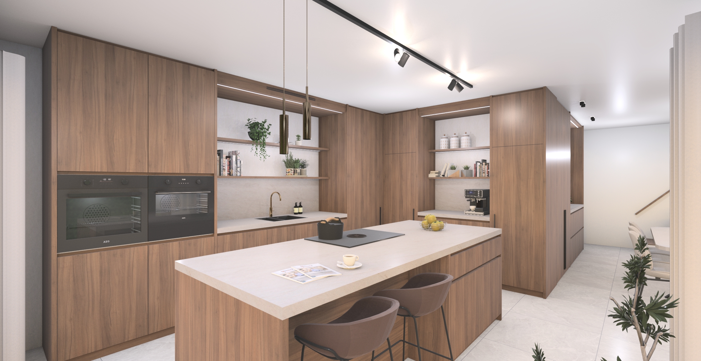 enhance this photo of a kitchen into a professional interior image optimize the lighting so the space appears bright natural and inviting with soft realistic light entry and balanced shadows subtly increase sharpness and clarity correct white balance and colors so that materials such as wood stone metal and lacquer appear true to life and luxurious ensure the overall look is sleek stylish and high end without changing the layout furniture or architecture maintain a realistic appearance refine contrast and details reduce noise and give the photo a warm elegant interior style like in a premium kitchen catalog
