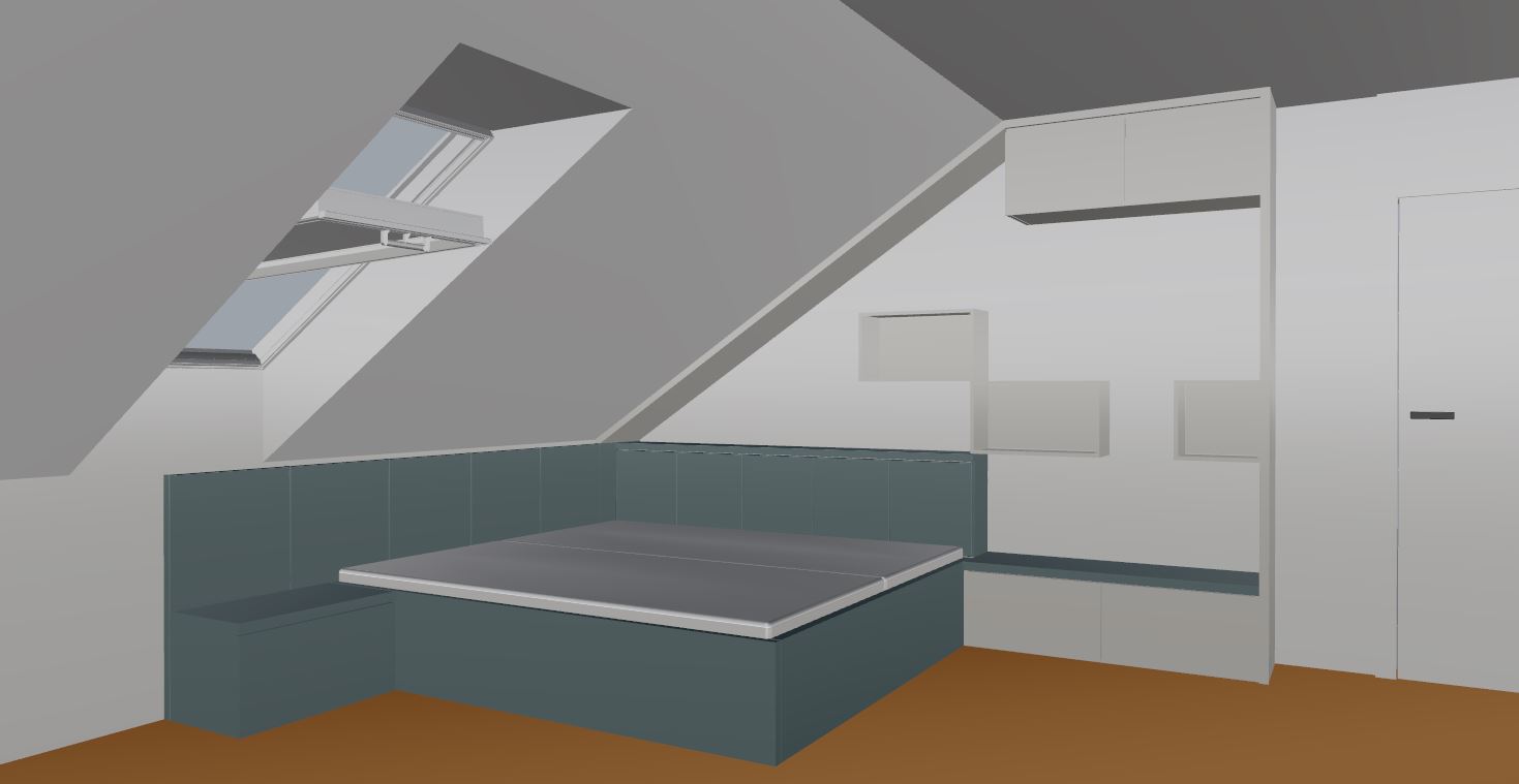 create a photorealistic render of a children s bedroom the furniture has light beige solid parts in egger u707 st9 decor the slanted panel running from the bed up to the upper cabinets is also finished in egger u707 st9 decor the dark green parts of the furniture are upholstered with a soft fine textile texture in a petrol deep teal green shade all upholstered elements should look soft comfortable and padded the bed contains two mattresses the bed is dressed with a bedsheet pillow and duvet styled in a casually made relaxed way place toys for a small boy on the shelves toy cars and children s books on the bedside table add a modern minimalist lamp the floor is a natural oak wood finish the scene is bright and airy with daytime natural sunlight creating a warm and calm atmosphere style ultra realistic high detail soft natural lighting clean contemporary interior design realistic materials and textures