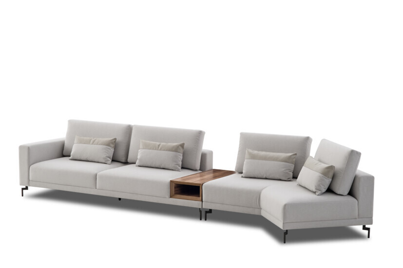create a modern architectural living room that highlights a large modular sofa in light beige fabric featuring clean lines black metal legs and a central wooden table element integrated into the design the space should feel elegant sculptural and inviting with a balance between minimalism and warmth use a refined color palette of beige taupe soft gray and warm wood tones add textural contrast through materials like stone linen leather and metal the environment should include architectural details such as a wide window with natural light a low modern coffee table and subtle decor books ceramic vases abstract art lighting should be soft and directional emphasizing shadows and form to give the sofa presence and depth the atmosphere must convey modern sophistication with personality calm confident and luxurious without excess visual style brazilian inspired modern interior tactile and editorial with sculptural furniture and harmonious proportions