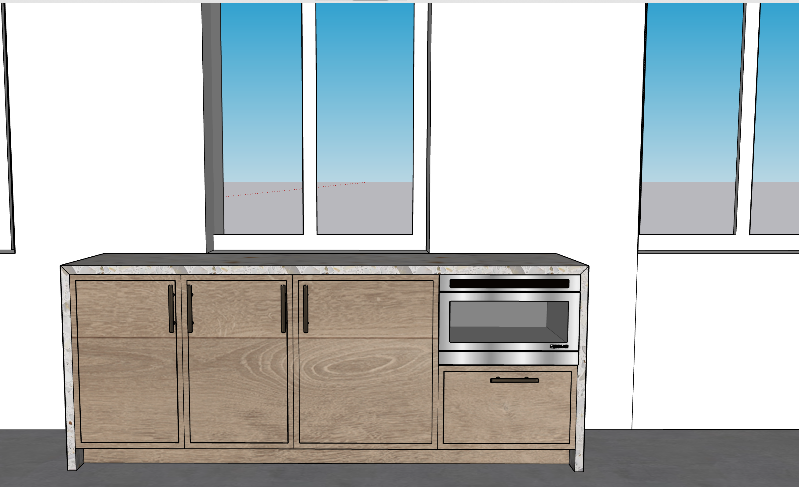 please make the lighting soft even warm and bright keep material as they are shown in the image make the material on the cabinet front white oak make the walls white make the view outside the window have a fire escape and buildings