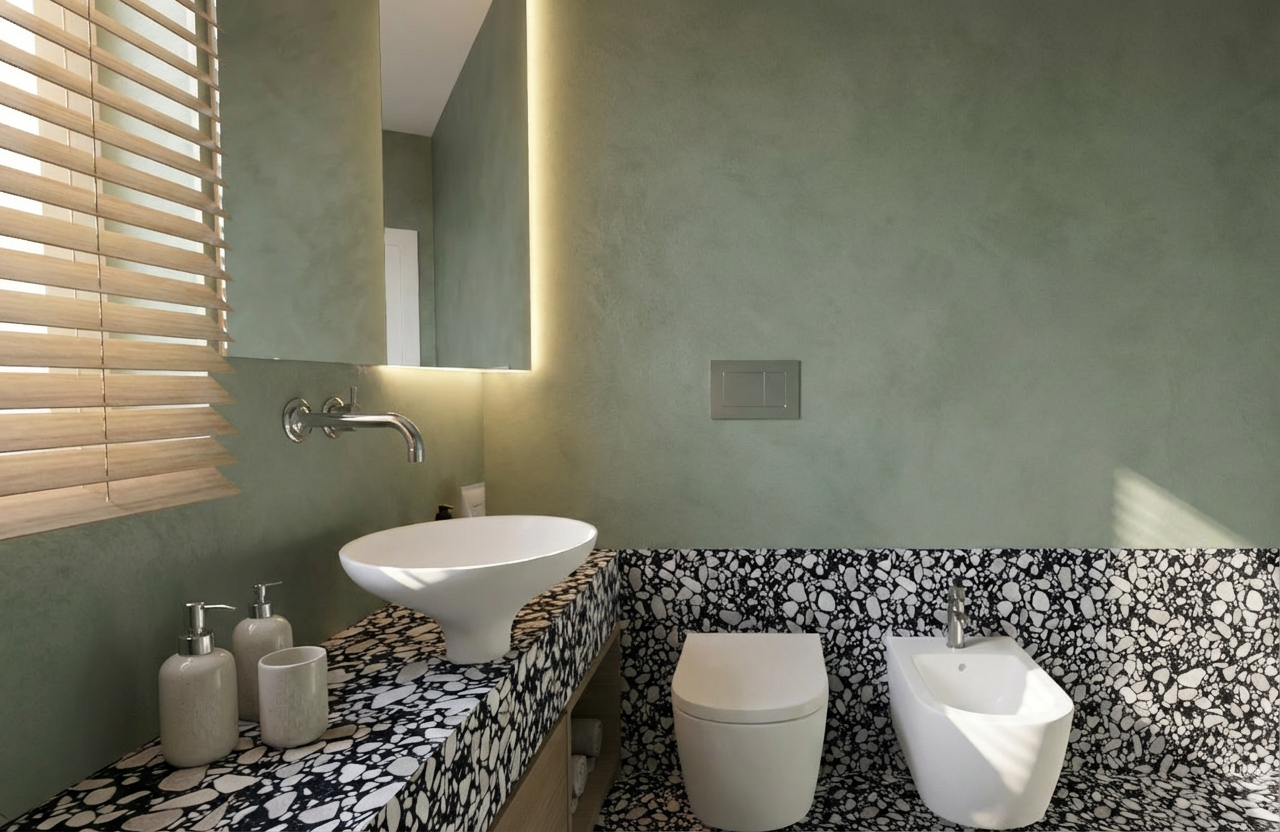 replace black tiles with dark green same size same gloss dark stone on the floor wall stucco instead of marble