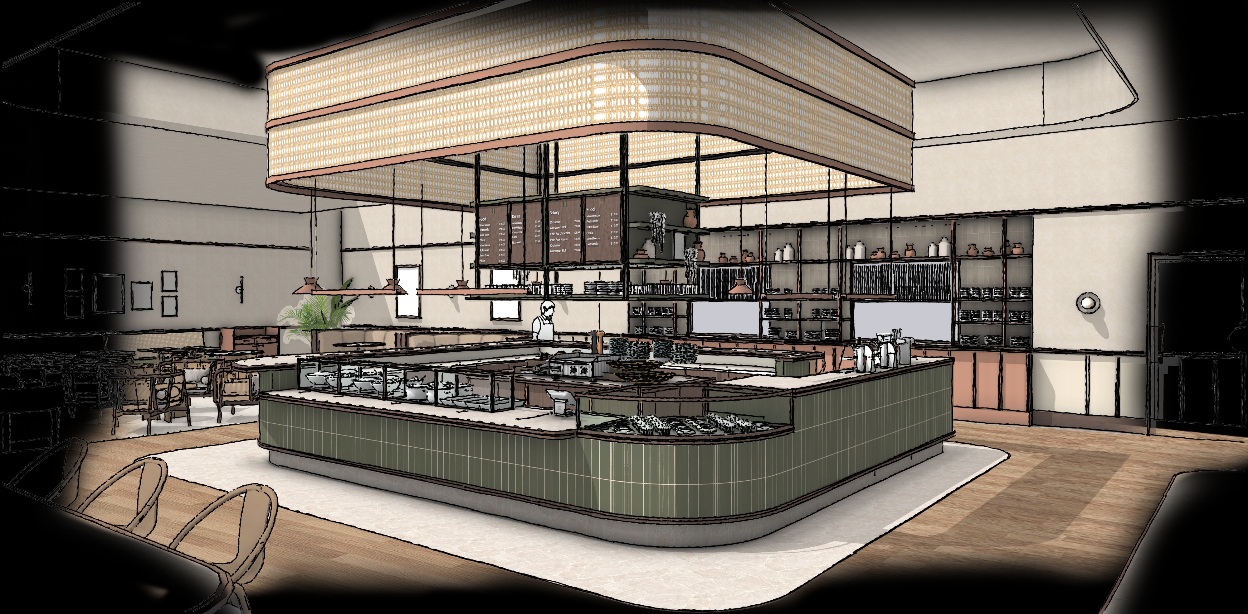 turn this sketch into a photorealistic architectural digest editorial style image with a daytime setting add people