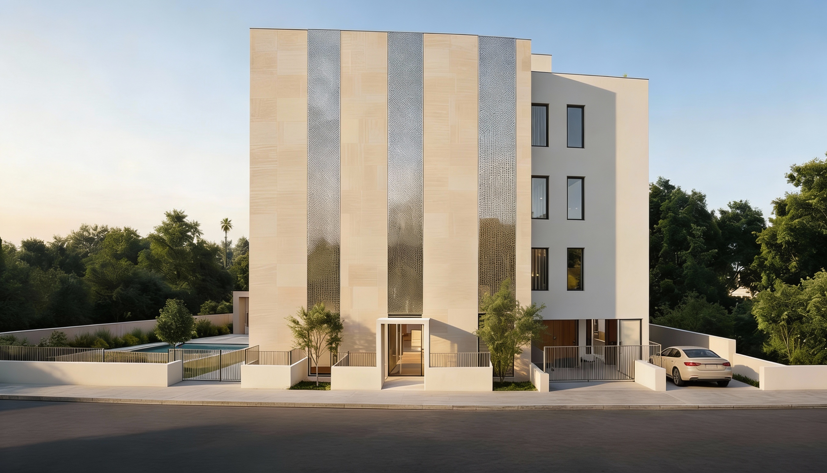 make no changes to the existing image architecture site people lighting materials landscaping or camera do not modify any geometry surfaces shadows or composition add one realistic luxury bmw only on the far right side of the image positioned naturally on the existing driveway ramp area at the extreme right the car must sit correctly on the current ground surface aligned with the existing direction of the ramp the car should be realistic neutral and understated with correct scale perspective and soft shadows consistent with the scene lighting do not add or remove any people do not add any structures canopies walls lights or landscape elements everything else must remain pixel for pixel unchanged