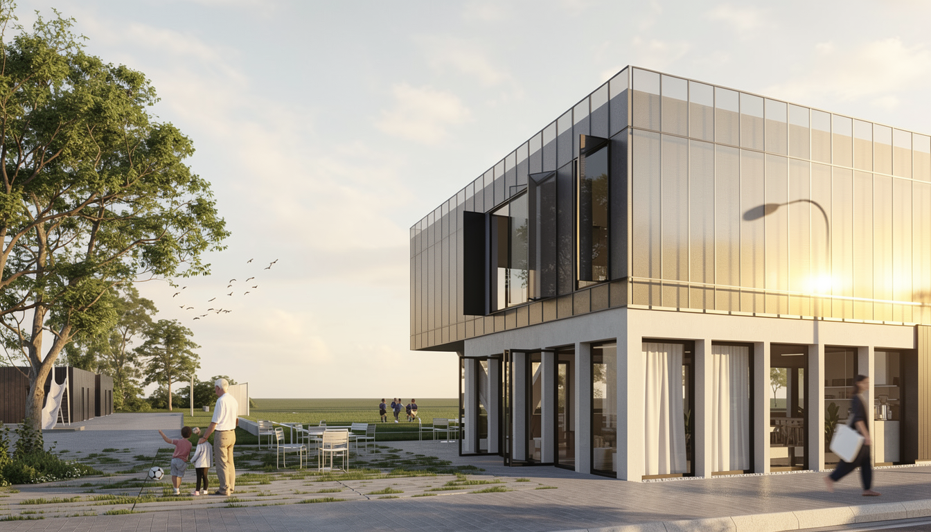 watercolour rendering no changes to architecture in image provided white siding for exterior roof are black add some subtle landscaping local to qc forest in background railing in model is black iron rods do not add in any additional railings not already in the model do not add any pathways this is the rear side of the house show grassy yard make windows and glass doors opaque so we don t see furniture inside