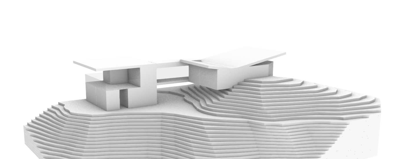 realistic architectural watercolor rendering of a small contemporary research station perched on a rugged rocky cliff structure composed of warm natural wood matte black steel and clear glass includes detailed roof structures for all buildings large windows a main entrance door exterior stairs connecting different levels and an open air amphitheater integrated into the landscape cantilevered volumes supported by visible steel beams anchored in stone surrounded by mountain pines fog and distant misty valleys rendered with highly realistic materials accurate lighting and precise architectural proportions crisp geometry softened by delicate watercolor textures background and edges transition into loose washes and white paper fade fine pencil and ink linework with subtle technical annotations atmospheric morning light with soft shadows concept architectural visualization balancing realism and artistic expression added butterfly roof