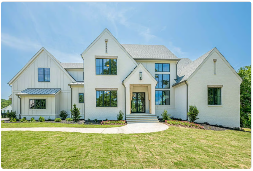 add european stone accent around an arched the front door colorado mountain backdrop black windows greyish brown shingles swap board and batten into white stucco
