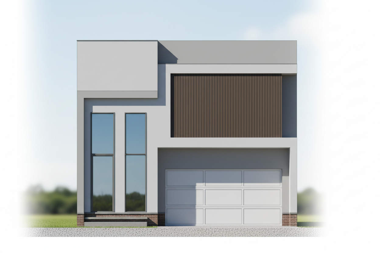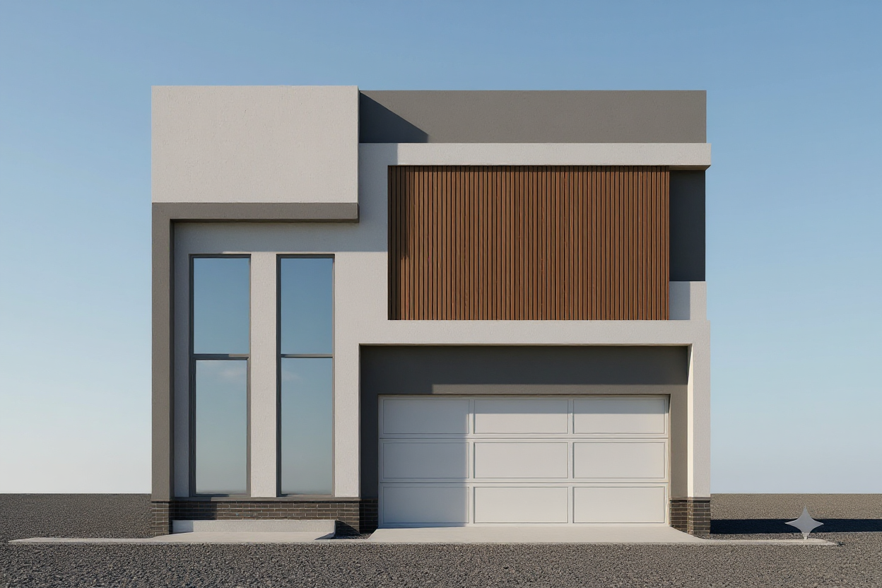more realistic modernist exterior shot visualize a modern residential building with a contemporary design the building should have wooden exterior walls large windows with reflective glass and sleek black accents along the edges the atmosphere should be light and airy with clear blue skies and soft sunlight casting soft shadows the surrounding landscape should include lush green grass colorful flowering shrubs and tall deciduous trees