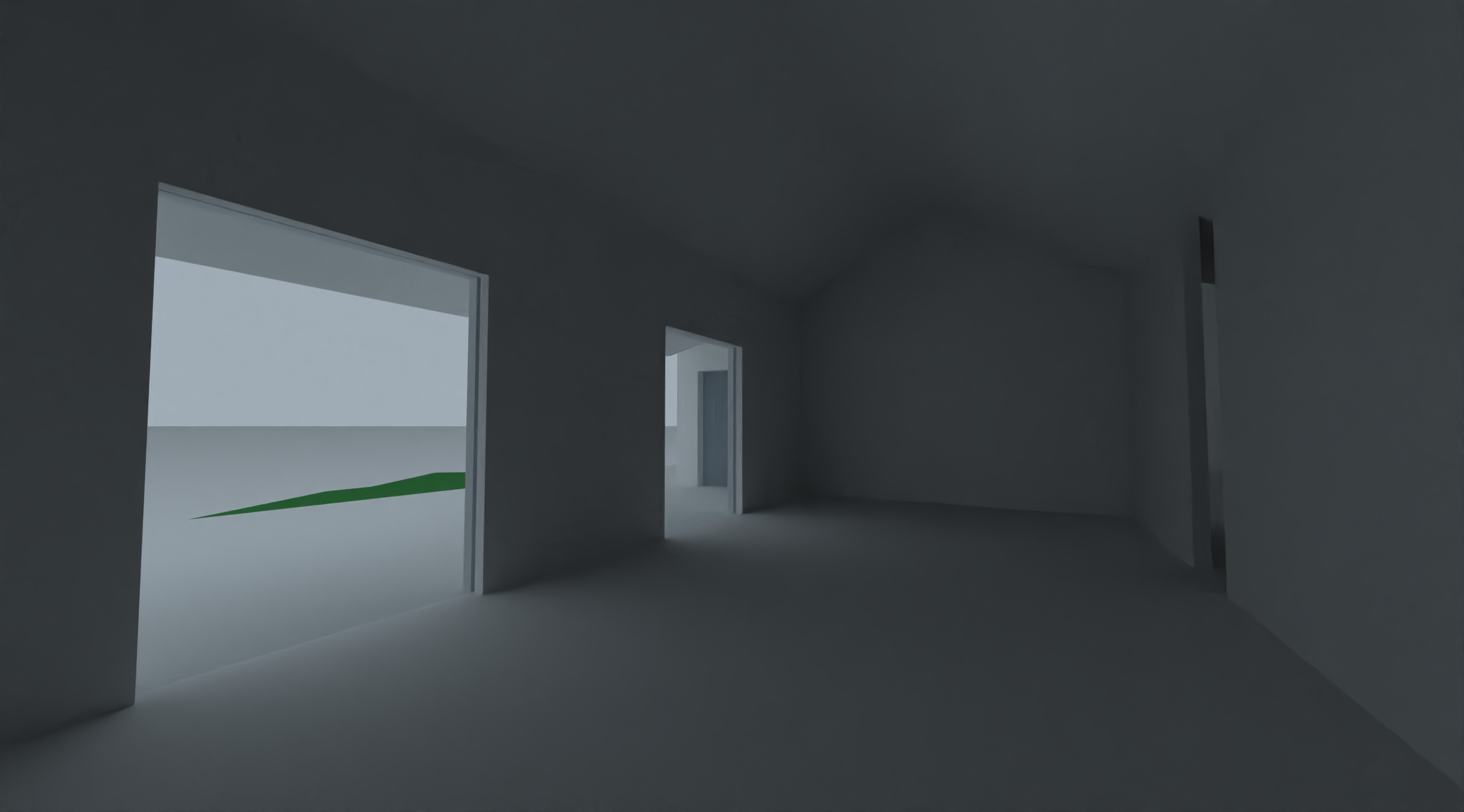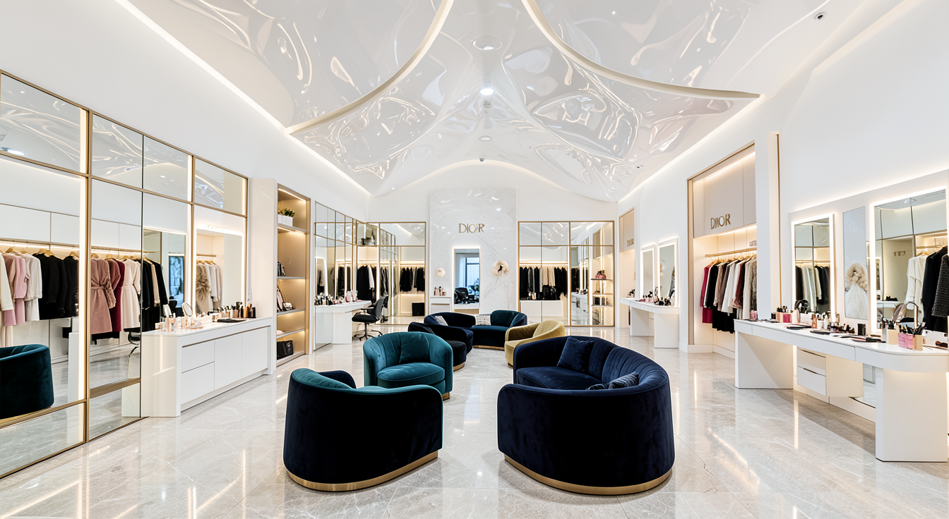 monumental private glamour salon with a very large open architectural volume and bright luminous atmosphere sculptural white ceiling with selective mirrored accents warm refined flooring front wall composed of large windows showing an exterior view with natural daylight no display elements or clothing near the windows maintain transparency and openness to the outside interior organization includes couture display only on solid interior walls with tall illuminated niches or vitrines presenting dresses and accessories in a curated residential way not retail spacious layout with minimal but elegant zones including a central social lounge with sculptural velvet seating beauty preparation counters with integrated mirror lighting manicure and styling areas arranged with generous circulation soft feminine luxury palette with blush coral deep red and champagne brass accents reflective materials used sparingly for glamour furniture and elements scaled small relative to the architecture large empty circulation areas ultra wide architectural rendering emphasizing height openness and private high end atmosphere