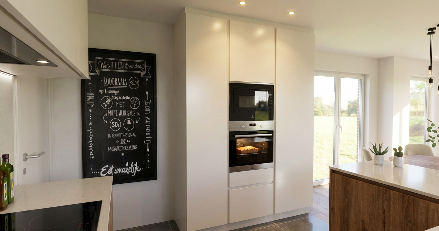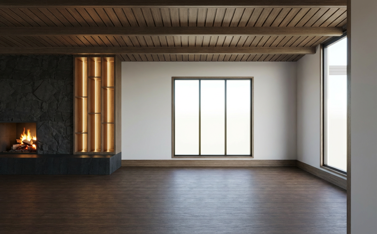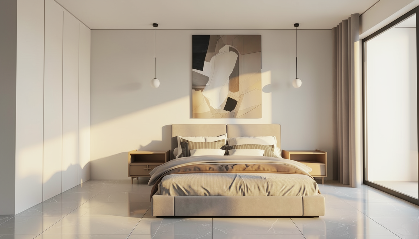 a warm room with light beige walls matte walnut l shaped wardrobe and nightstand the bed is upholstered in a grey fabric with a mix of brown and cream linens the floor is a lighter wood which compliments the furniture and the door is white with glass panels letting in only a little light the lights above the nightstand are solid black
