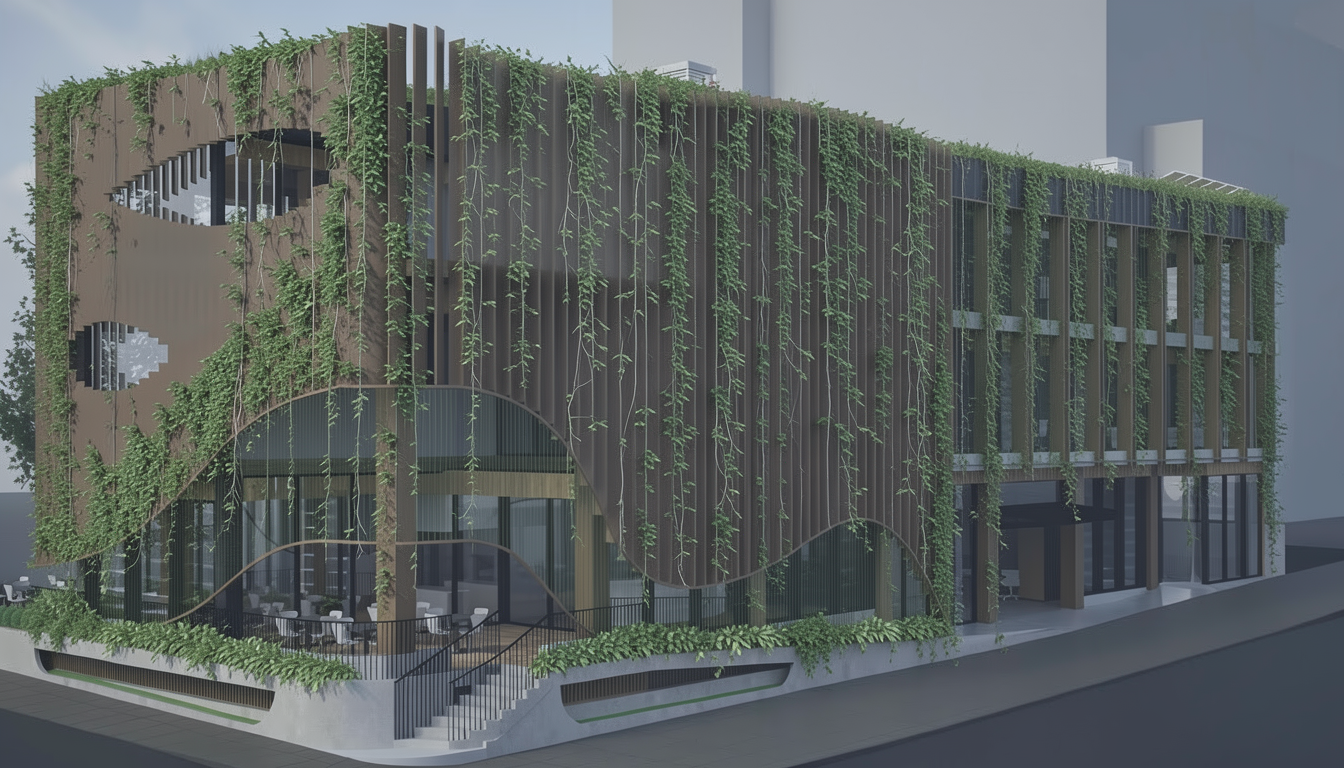 add an elegant looking and subtle vertical tensile planting onto the green wires make the leaves the smallest size so it looks very thin and elegant the planting crawls up only from the concrete planter boxes on the second and thrid floor reduce the density of the planting and instread increase the number of single vertical threads of planting use small leaves no vertical planting on the narrow spaced timber facade on the right side of the building