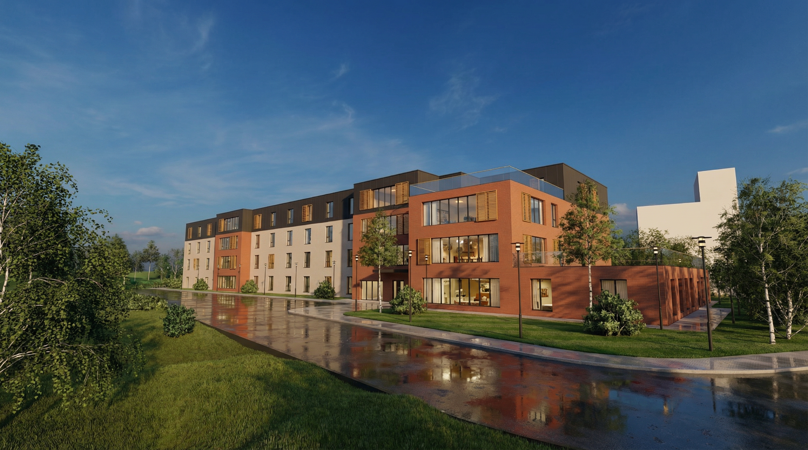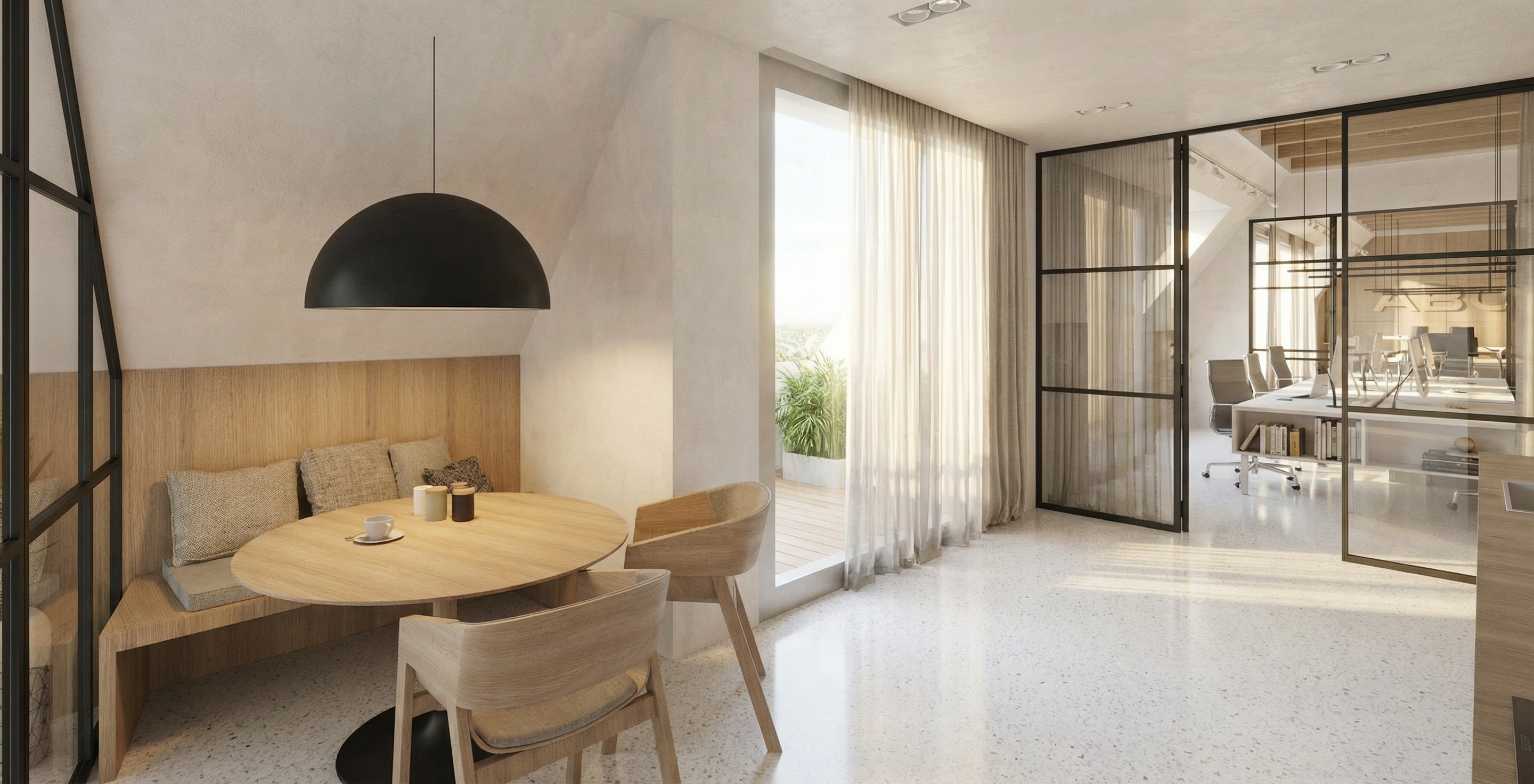 exterior shot transform the space into a gym with the machines on the sides maintaining the dimensions of the original space with the doors where their are at the original space and the existing furniture