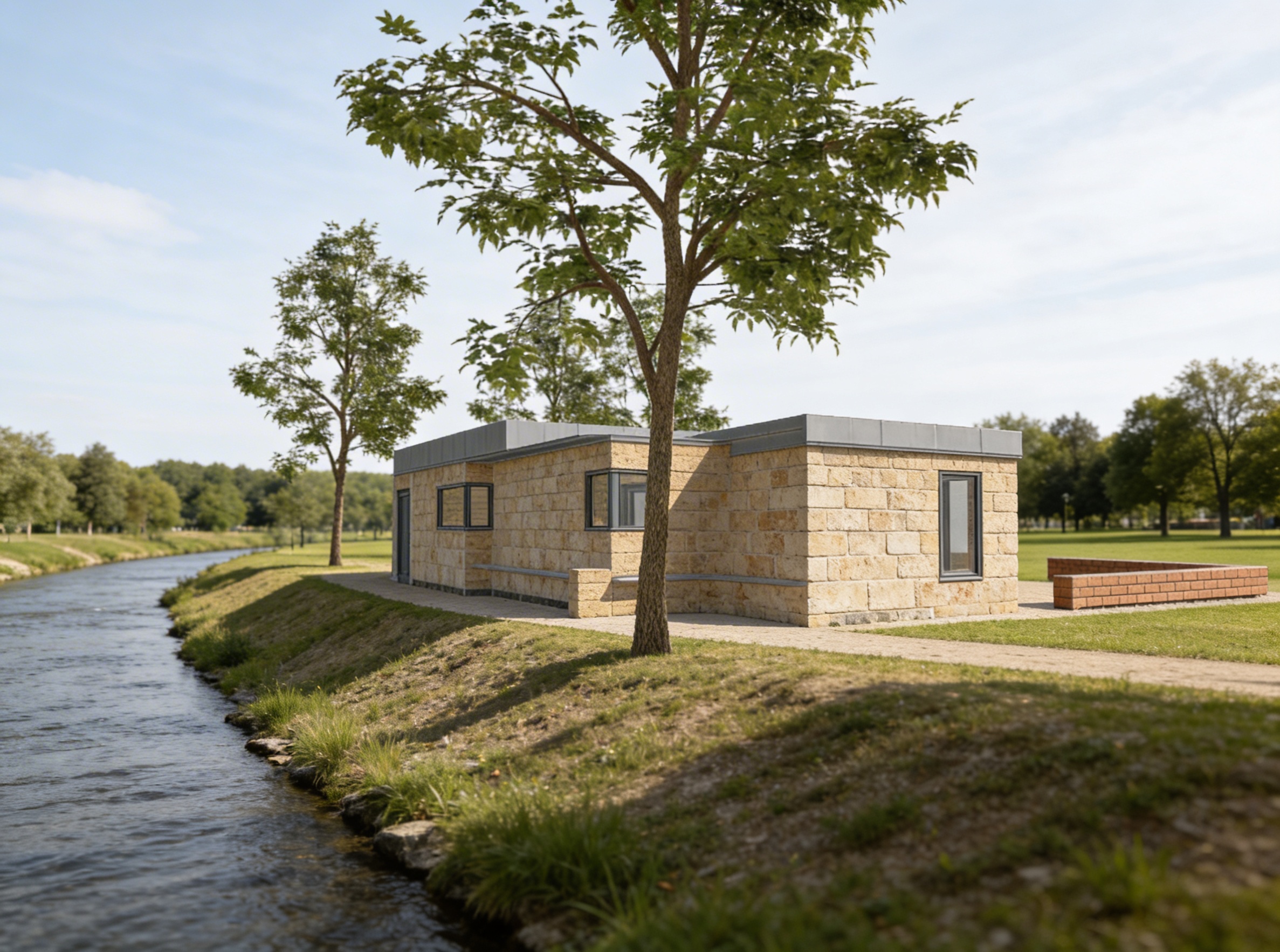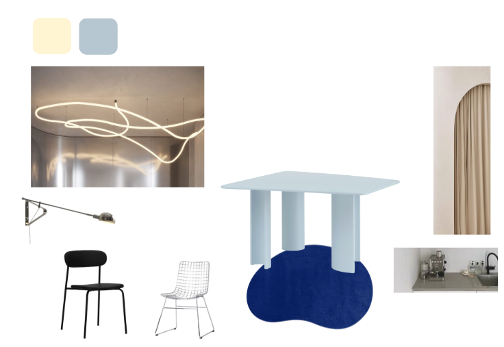 exterior shot please use exactly the geometrie and the materials like the example and add the stuff from the moodboard the light over the table and 5 mixed chairs round the table