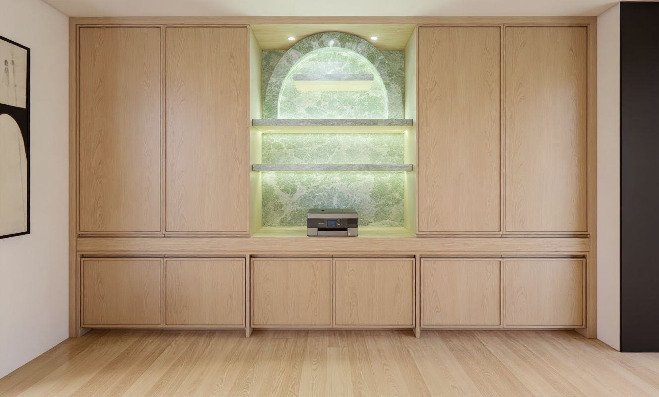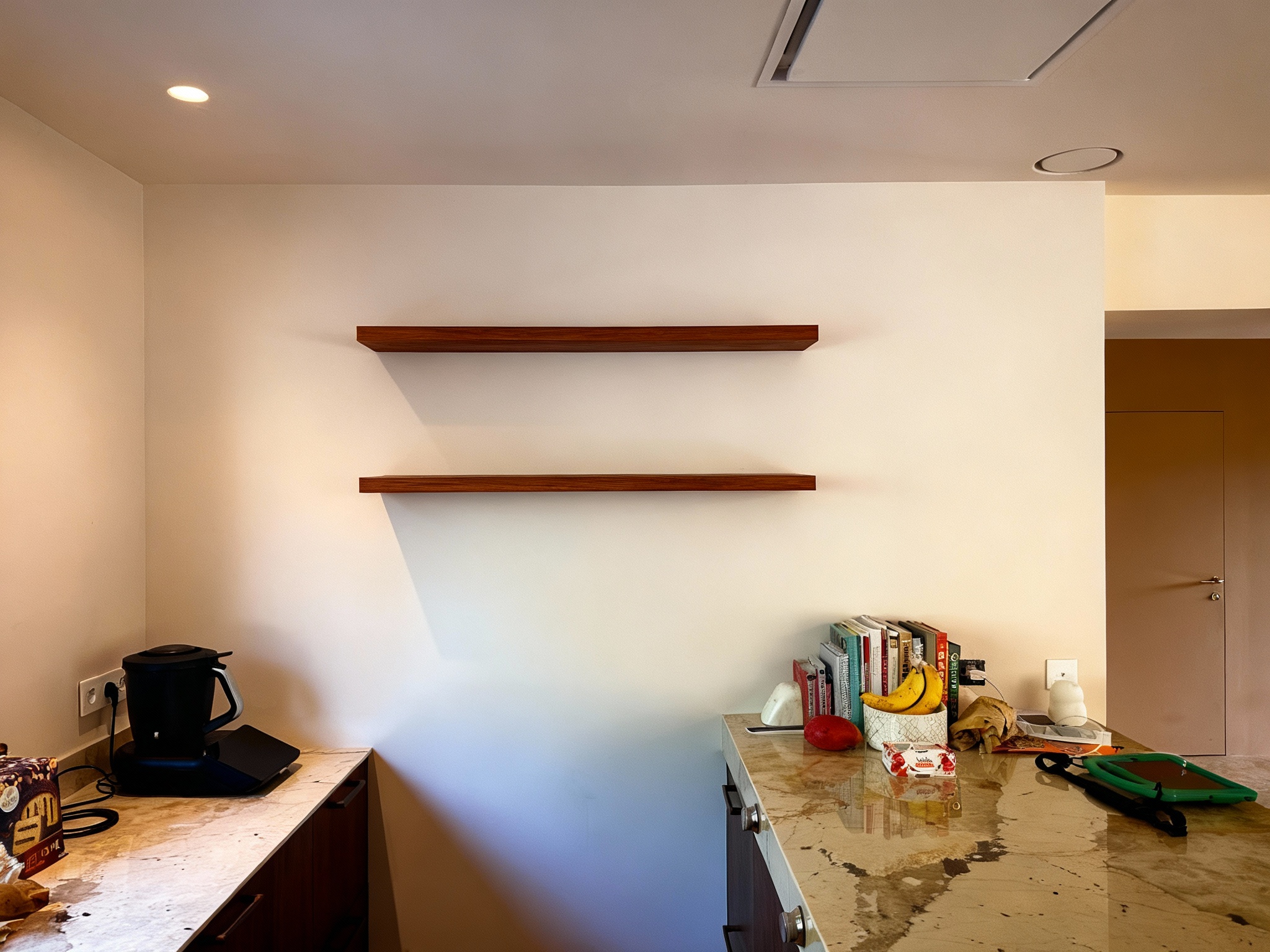 add two walnut shelves on the back wall the shelves are all the width of the wall the shelves are positioned halfway up the wall add some books and tea cups on the shelves more light
