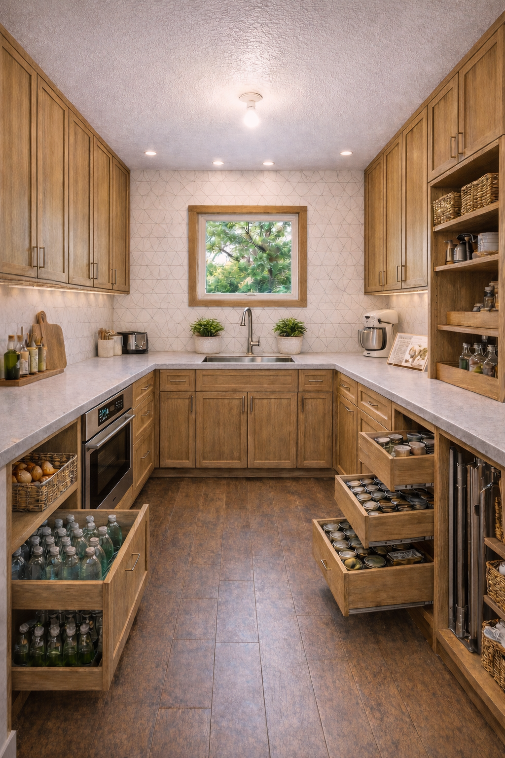 do not change any of the layout replace the color of the wood floor with a light white pine paint the cabinets accessible beige by sherwin williams hand texture the ceiling and paint it alabaster fix the tile backsplash to be a uniformed hexagon star pattern with little tiny gold circles in the center of the star and add black hardware to the cabinets