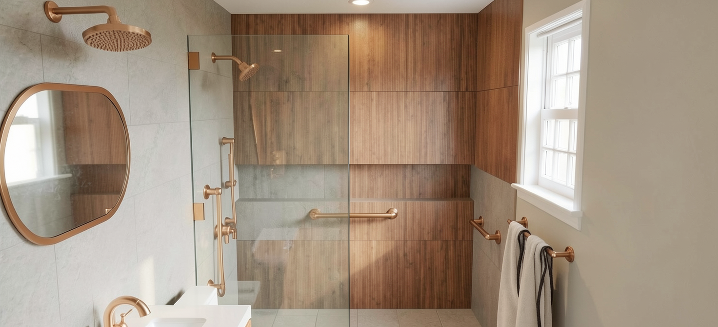 glass has a thin white semi transparent glass edge around it and the vanity light scones are white semi transparent glass turn the lighting at 3000k all plumbing fixtures are non emissive