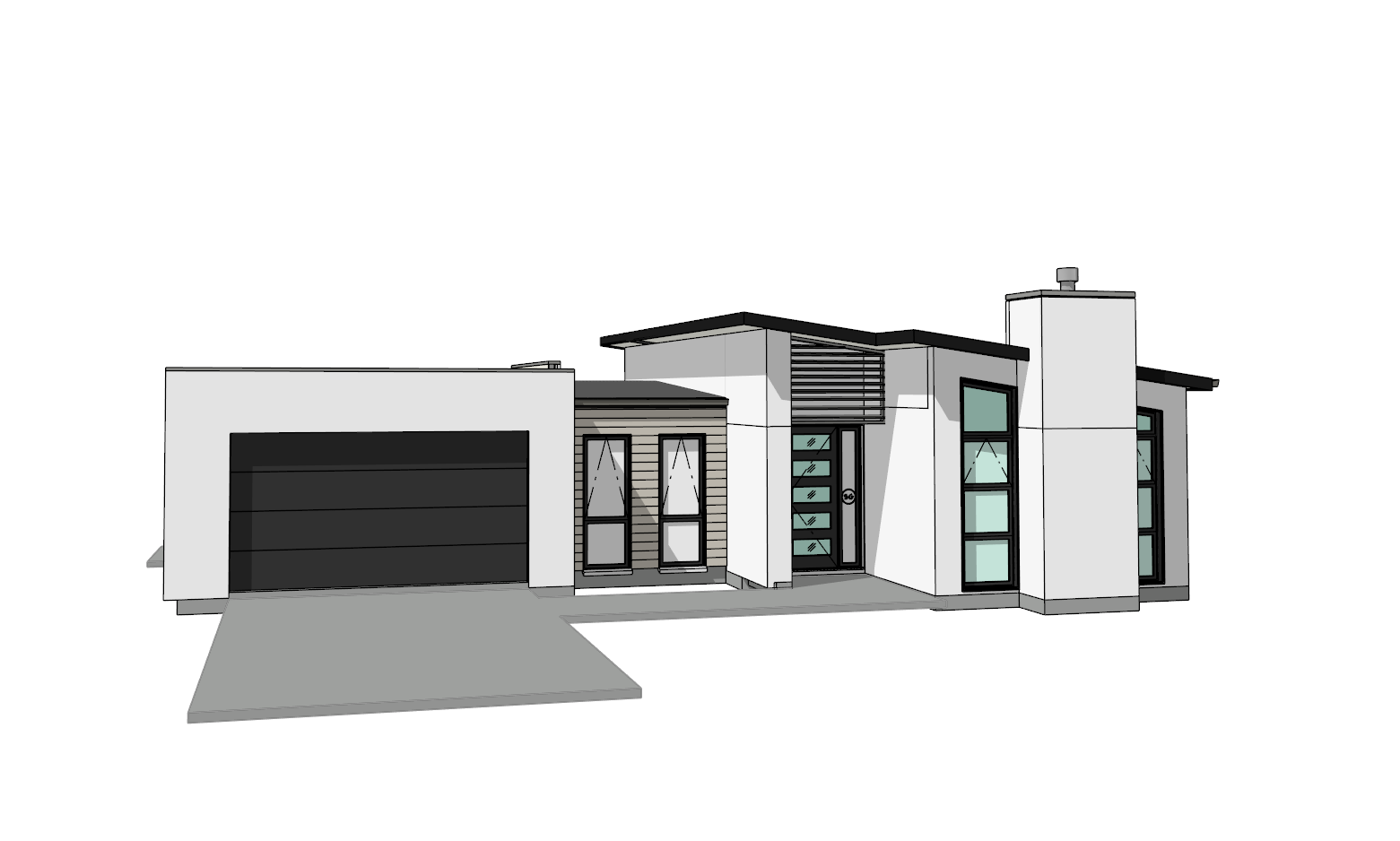 white brick black wood with a driveway and fencing short grass